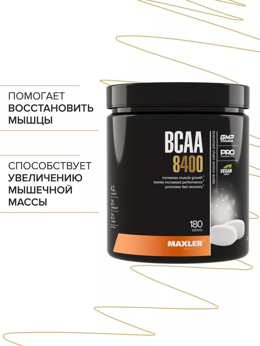 Maxler BCAA 8400 180 шт представляет собой три незаменимые аминокислоты с разветвленными цепочками: Л-Лейцин, Л-Изолейцин и Л-Валин в классической пропорции 2:1:1. Прием аминокислотного комплекса БЦА от Макслер необходим любому атлету, профессиональному спортсмену и бодибилдеру любителю так как они играют важную роль в построении мышц, стимулируют выработку инсулина, способствуют синтезу белка в организме, росту и поддержанию мышечной массы. БЦАА снижают болезненные ощущения и риск повреждения мышц во время физических нагрузок, ускоряют восстановление мышц после тяжелых и интенсивных тренировок, снижают усталость. БЦА служат источником энергии, повышают выносливость и силовые показатели, повышают аэробную и анаэробную производительность, если их принимать регулярно. Помогают бороться с подкожным жиром, способствуют улучшению мышечного рельефа, сохранению мышечной массы при сушке и похудении. Рекомендации по применению Maxler BCAA 8400 : принимать 1 порцию (6 таблеток) в день. Принимайте БСАА 8400 до и после тренировок для увеличения мышечной массы, выносливости, а также быстрого восстановления.Для удобства приготовления спортивных коктейлей рекомендуем воспользоваться фирменным шейкером для спорт пита.Выбирая Maxler, вы выбираете качество.