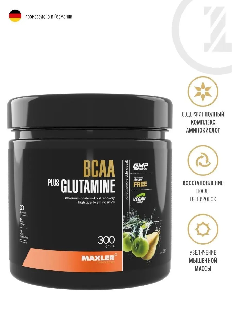 Аминокислоты Maxler BCAA + Glutamine 300г со вкусом Зеленое Яблоко-Груша. Поскольку Glutamine / Глютамин и BCAA / БЦАА аминокислоты, которые играют важную роль в восстановлении мышц, то продукт Maxler BCAA + Glutamine отличная добавка для любого атлета. Данный продукт снабжает организм самой распространенной аминокислотой в организме человека - Глютамином, а также незаменимыми аминокислотами с разветвленными цепями - Лейцином, Валином и Изолейцином. Глютамин защищает мышцы от катаболизма, помогая нарастить и сохранить мышечную массу. BCAA играют важную роль в росте и развитии мышц, а также способствуют быстрому восстановлению после интенсивных физических нагрузок. Maxler BCAA + Glutamine / Макслер БЦАА + Глютамин - уникальный продукт для дополнительной энергии и восстановления вашего организма, который представлен в нескольких натуральных вкусах. Рекомендации по применению: для получения 1 порции смешайте 10 г. порошка с 250 мл. воды.