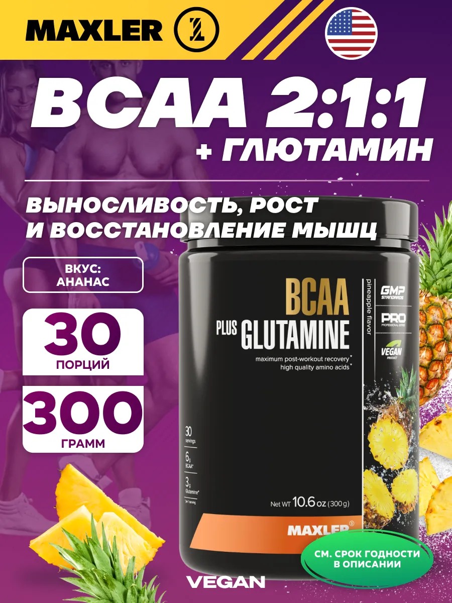 Годен до 31.12.2027. BCAA + Glutamin BCAA + Glutamine 300 г, Ананас. Для восстановления нашим мышцам необходимы аминокислоты. Именно поэтому хорошо заканчивать тренировку протеиновым коктейлем. Однако некоторые аминокислоты более эффективно способствуют восстановлению. Мы объединили их в нашей добавке Maxler BCAA + Glutamine.BCAA — это группа незаменимых аминокислот, которые способствуют росту мышц. Они также помогают бороться с усталостью и уменьшают болезненность мышц после тренировки, что делает их идеальной добавкой для восстановления. Если вы худеете, они помогут сохранить мышечную массу. Глютамин — ещё одна важная аминокислота, которая может снизить мышечную боль и ускорить восстановление. Это протеиногенная аминокислота, то есть она входит в состав белков и способствует росту мышц. Также глютамин полезен для иммунной системы, особенно при интенсивных тренировках.Maxler BCAA + Glutamine — это отличное сочетание четырёх аминокислот. Они поддерживают энергию и силы во время занятий и помогают восстанавливаться после интенсивных тренировок. Станьте лучше вместе с Maxler!Восстановление играет ключевую роль в достижении успеха. Никому не хочется чувствовать себя плохо, особенно если у вас запланировано несколько тренировок подряд. BCAA и глютамин содержат аминокислоты, которые уменьшают болезненность и способствуют восстановлению, позволяя вам быстро вернуться к полноценным тренировкам и выкладываться на все сто.