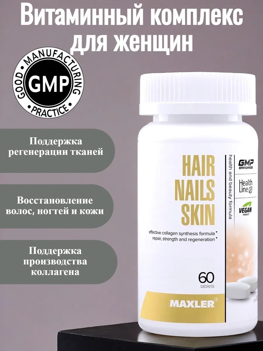 Торговое наименованиеБиологически активная добавка к пище МАКСЛЕР «Хэир Нейлз Скин» / MAXLER «Hair Nails Skin», таблетки по 1 г №60