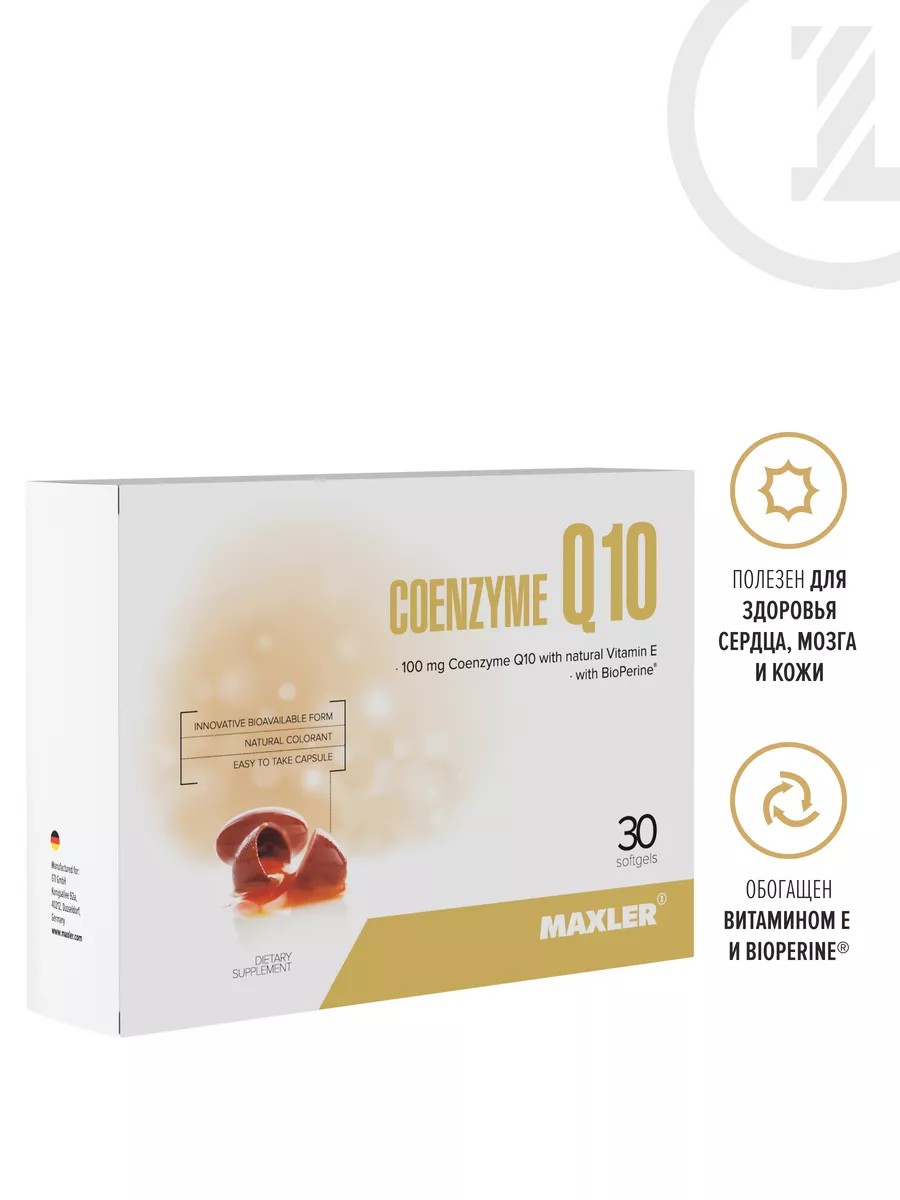 Maxler Coenzyme Q10 сочетает этот компонент с натуральным витамином Е и BioPerine. Известно, что он поддерживает: