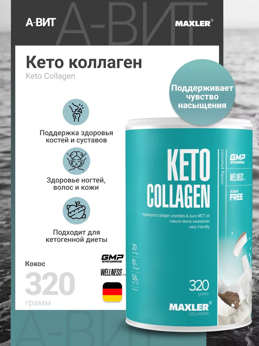 Maxler Keto Collagen 320 г Кокос. Все слышали о коллагене — это самый распространенный белок в организме, который составляет около 30% белков во всём теле. Он стал настоящей легендой в мире пищевых добавок и не без оснований. Коллаген является важным строительным материалом для кожи, костей, связок и большей части соединительных тканей. В теле человека коллаген вырабатывается самостоятельно. Однако с возрастом эта функция снижается, поэтому будет полезно ввести добавку коллагена в свой рацион.