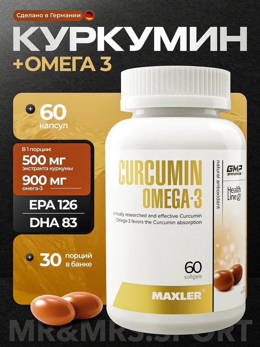 Maxler Curcumin Omega-3 60 Capsules. Maxler has developed an innovative Curcumin Omega-3 supplement for women and men, based on high-quality curcumin extract from Meriva. Meriva's signature curcumin is produced using a patented technology from premium raw materials. Optimal bioavailability is achieved by enriching the softgel capsules with natural omega-3 fatty acids (EPA/DHA), which facilitate the easy absorption of curcumin while preserving its valuable properties. Curcumin is a natural antioxidant that strengthens the immune system and effectively protects cells from microbes, viruses, and infections. Curcumin improves cardiovascular and circulatory function, supports bone health, joint mobility, and ligament elasticity. Directions: For general strengthening, take 2 Curcumin Omega-3 capsules daily, preferably with meals. The recommended course duration is 1-2 months, after which you should take a break.