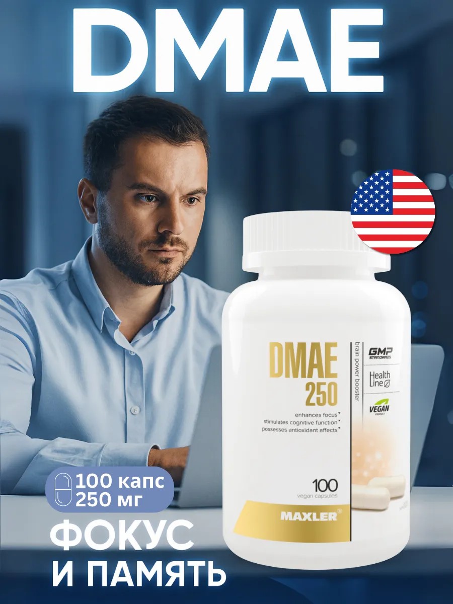 Макслер DMAE 250мг - это Ваш ключ к ясному уму и острой памяти! Уникальная формула содержит ДМАЭ (диметиламиноэтанол) - природное соединение, которое присутствует в Вашем мозге и стимулирует выработку ацетилхолина. Этот важнейший нейротрансмиттер помогает нейронам передавать сигналы, активизируя деятельность мозга словно мощный двигатель.