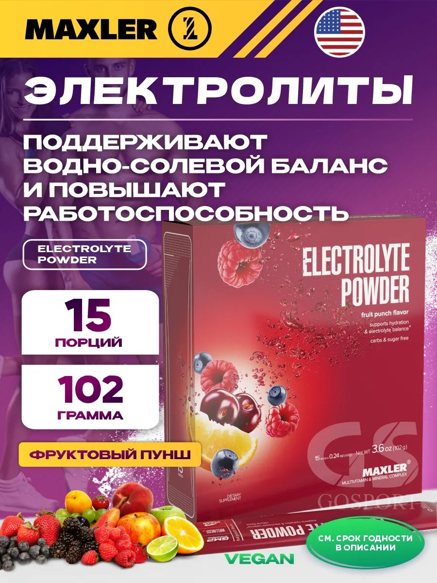 Годен до 30.09.2026. Электролиты Electrolyte Powder 15 х 6,8 г, Фруктовый пунш. Спортивное питание Maxler Electrolyte Powder — это формула, которая превращает обычную воду в напиток, наполненный электролитами. Вот преимущества каждого из электролитов, содержащихся в электролитном порошке: натрий помогает при мышечных сокращениях, а также поддерживает кровяное давление; калий работает вместе с натрием и помогает регулировать уровень воды и частоту сердечных сокращений; магний полезен для работы нервов, мозга и сердца; хлорид может помочь скорректировать кислотность крови; кальций помогает нашим нервам посылать сигналы и сокращать мышцы. Maxler Electrolyte обеспечивает ваш организм необходимыми электролитами для эффективной тренировки. Веганский порошок не содержит искусственных ароматизаторов и красителей и гарантирует, что вы сохраните водный баланс, независимо от того, что вы делаете. Electrolyte – это передовые технологии, специально разработанная формула и тщательно отобранные ингредиенты. Он поддерживает ваш активный образ жизни и повышает производительность. Электролитный порошок Макслер содержит комплекс микроэлементов, в том числе медь, фосфор, хром и другие минералы. Они имеют широкий спектр функций: от выработки гормонов, предотвращения окислительного повреждения и даже контроля уровня сахара в крови. Их часто упускают из виду, но они необходимы для отличной производительности и здоровья. Такие компоненты являются не только неотъемлемой частью профессионального питания, но и незаменимыми для вашей красоты и здоровья. Maxler Electrolyte — это веганская добавка, которая также не содержит глютена и молочных продуктов. Кроме того, в порошке низкое содержание углеводов и сахара, что позволяет вам достичь целей по гидратации, не принимая дополнительных калорий. Могу ли я использовать электролитный порошок, если я не спортсмен? Да! Порошок электролита Maxler — отличный способ регидратации во время болезни — поскольку формула не содержит дополнительных сахаров, вы можете быть уверены, что получаете всю пользу от воды и присутствующих минералов, не беспокоясь о дополнительных калориях. Если вы находитесь в очень жаркой среде, Maxler Electrolyte поможет вам избежать обезвоживания, гарантируя, что ваше тело останется прохладным. В следующий раз, когда вы отправитесь в отпуск, не забудьте взять с собой пакетики с электролитным порошком, чтобы быстро повысить уровень электролитов. Одинаково подходит и для мужчин, и для женщин. Рекомендации по применению: в качестве пищевой добавки смешайте 1 порцию (6,8 г) с 350-473 мл воды.