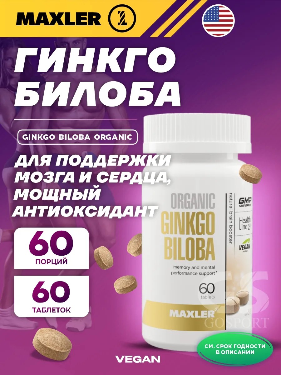 Expires until December 31, 2028. Ginkgo Biloba Organic Extract 60 Tablets. Ginkgo biloba extract is made from the leaves of the plant. It has many benefits: it helps support brain health, improves circulation, and reduces inflammation. Ginkgo biloba is rich in antioxidants, such as flavonoids and terpenoids. These are two groups of antioxidants found in plants, and they can fight free radicals that can damage our cells. Ginkgo biloba can increase blood circulation, which, combined with its antioxidants, can be beneficial for brain health. It can support cognitive function by improving memory and attention. This can improve well-being. Ginkgo can be an excellent aid in times of stress. Ginkgo biloba not only supports brain function but is also beneficial for the entire body. The antioxidant content of the extract supports the body's health. Its anti-inflammatory properties can be useful for long-term inflammation. Ginkgo biloba can also improve circulation and increase levels of compounds that help dilate blood vessels. The combination of anti-inflammatory compounds and improved circulation can help keep your cardiovascular system in tip-top shape. Maxler Organic Ginkgo Biloba is an excellent supplement for those looking to support brain and heart health. This organic supplement is vegan, gluten-free, and sure to fit any lifestyle. Ginkgo is excellent for improving circulation, meaning your muscles will receive more oxygen during exercise. This can help with endurance. It also helps improve concentration and alertness if you're involved in sports that require quick reactions. Ginkgo Biloba can be a useful component of professional sports nutrition for athletes and those involved in sports or fitness. The product is suitable for men and women who care about their health and beauty. Directions for use: Take one serving (1 tablet) daily, preferably with a meal.