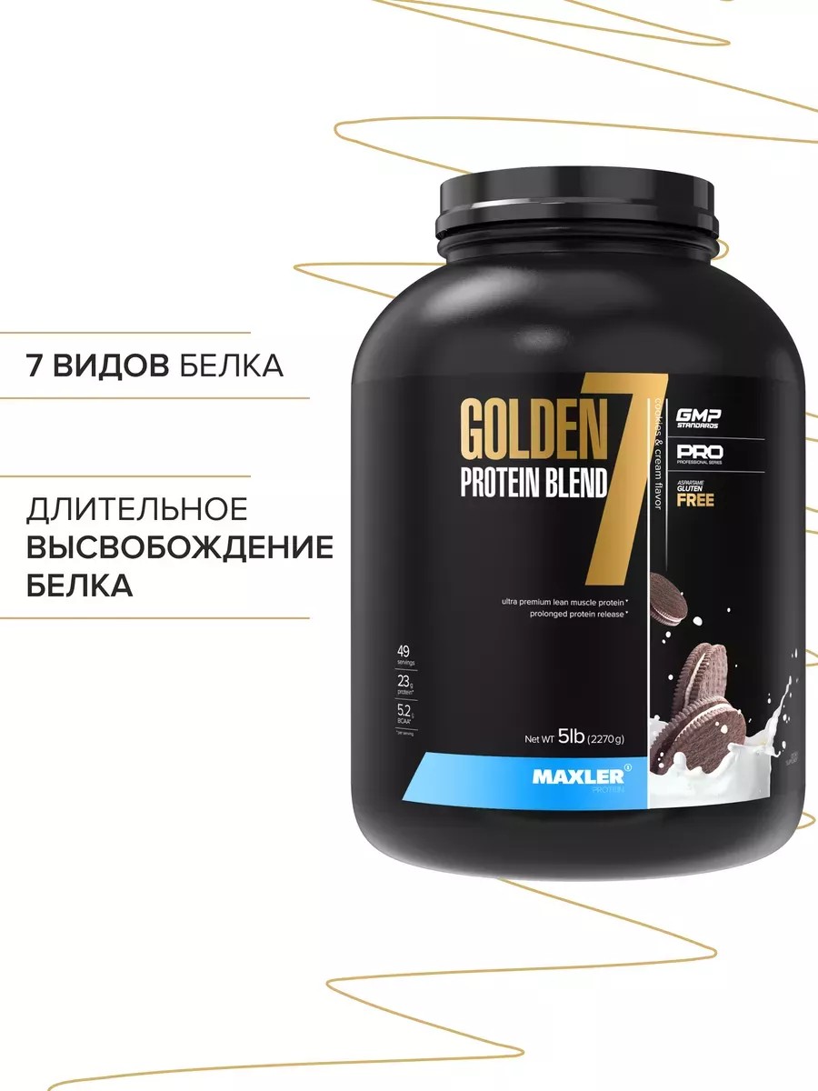 Golden 7 Protein Blend 2270г Печенье и Крем - эффективная многокомпонентная протеиновая смесь (концентрат сывороточного протеина, концентрат молочного протеина, гидролизат сывороточного протеина, изолят молочного протеина, мицеллярный казеин, казеинат кальция и изолят сывороточного протеина). 7 видов высококачественных молочных протеинов содержат 23 г белка, 14,8 г EAA (включая 7,3 г BCAA) и 180 калорий на порцию, которые помогают восстановиться после тренировки, поддерживают мышечную массу и помогают достичь ваших целей в области питания. Для поддержания процессов наращивания мышечной массы необходим постоянный источник аминокислот. Комбинация белков в формуле обеспечивает быстро впитывающуюся сыворотку для легкого восстановления после тренировки наряду с казеином более длительного действия, который медленно высвобождает аминокислоты для постоянного синтеза белка. Принимайте Golden 7 до и после тренировки, между приемами пищи или в любое другое время, когда вам требуется быстрая порция белка. Golden 7 идеально подходит для активных людей и для всех, кто ищет дополнительный источник белка. Golden 7 поддерживает рост мышечной массы и повышает качество процессов восстановления после тренировки для достижения лучшего результата. Рекомендации по применению Maxler Golden 7 Protein Blend 5lb Cookies & Cream: Смешайте 1 мерную ложку с 240-300мл воды или молока. Варьируйте количество жидкости для достижения желаемого вкуса и консистенции. Взбивайте до 1 минуты. Дайте немного настояться и наслаждайтесь!