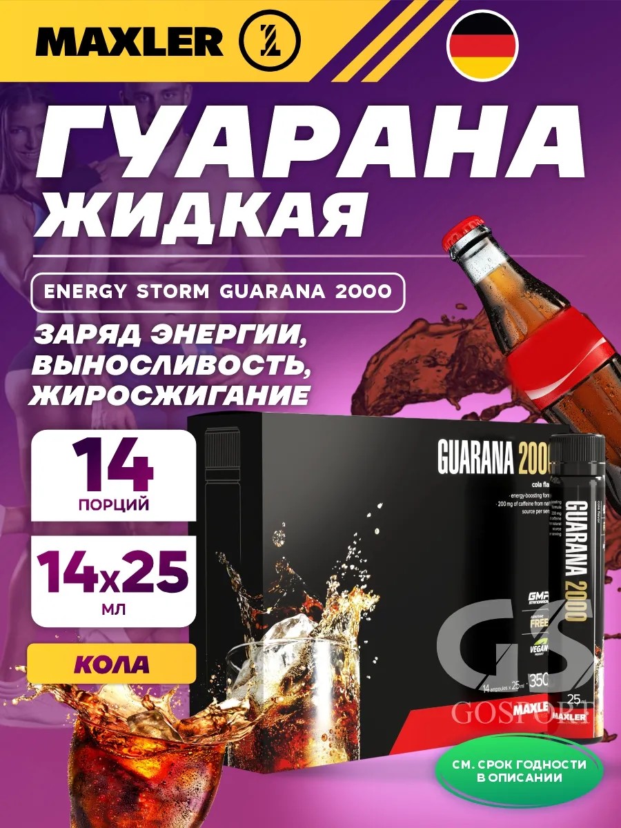 Годен до 12.09.2027. Гуарана Energy Storm Guarana 2000 14x25мл, Кола. Гуарана - это растение, известное своими энергетическими свойствами и способностью повысить выносливость организма. Ее экстракт содержит кофеин, который помогает бодрствовать и бороться с усталостью. Прием гуараны способствует улучшению физических показателей, таких как выносливость и энергетический уровень. Она также помогает улучшить ясность ума и память, повышает настроение и снимает усталость. Гуарана является идеальным дополнением к тренировкам и спортивному питанию. Она способствует повышению энергии и выносливости, а также помогает улучшить работу мышц. Добавка на основе гуараны подходит как для мужчин, так и для женщин, идеально подходит для спортсменов и людей, ведущих активный образ жизни. Гуарана также содержит антиоксиданты, которые помогают защитить клетки организма от повреждения свободными радикалами. Гуарана — мощный помощник для тех, кто хочет похудеть. Натуральный кофеин способствует снижению веса, ускоряя обмен веществ. Кроме того, витамин С помогает сжигать больше жира во время тренировок. Витамины B1, B5 и B6 помогают высвобождать энергию из пищи, сохраняя заряд энергии во время тренировок. Guarana 2000 - это натуральное средство, которое поможет вам получить дополнительную энергию, повысить выносливость и улучшить физические показатели. Не упустите возможность воспользоваться всеми ее преимуществами и достичь новых высот в своей спортивной деятельности. Рекомендации по приему пищевой добавки: выпить 1 порцию (25 мл) жидкой гуараны в чистом виде или с водой.