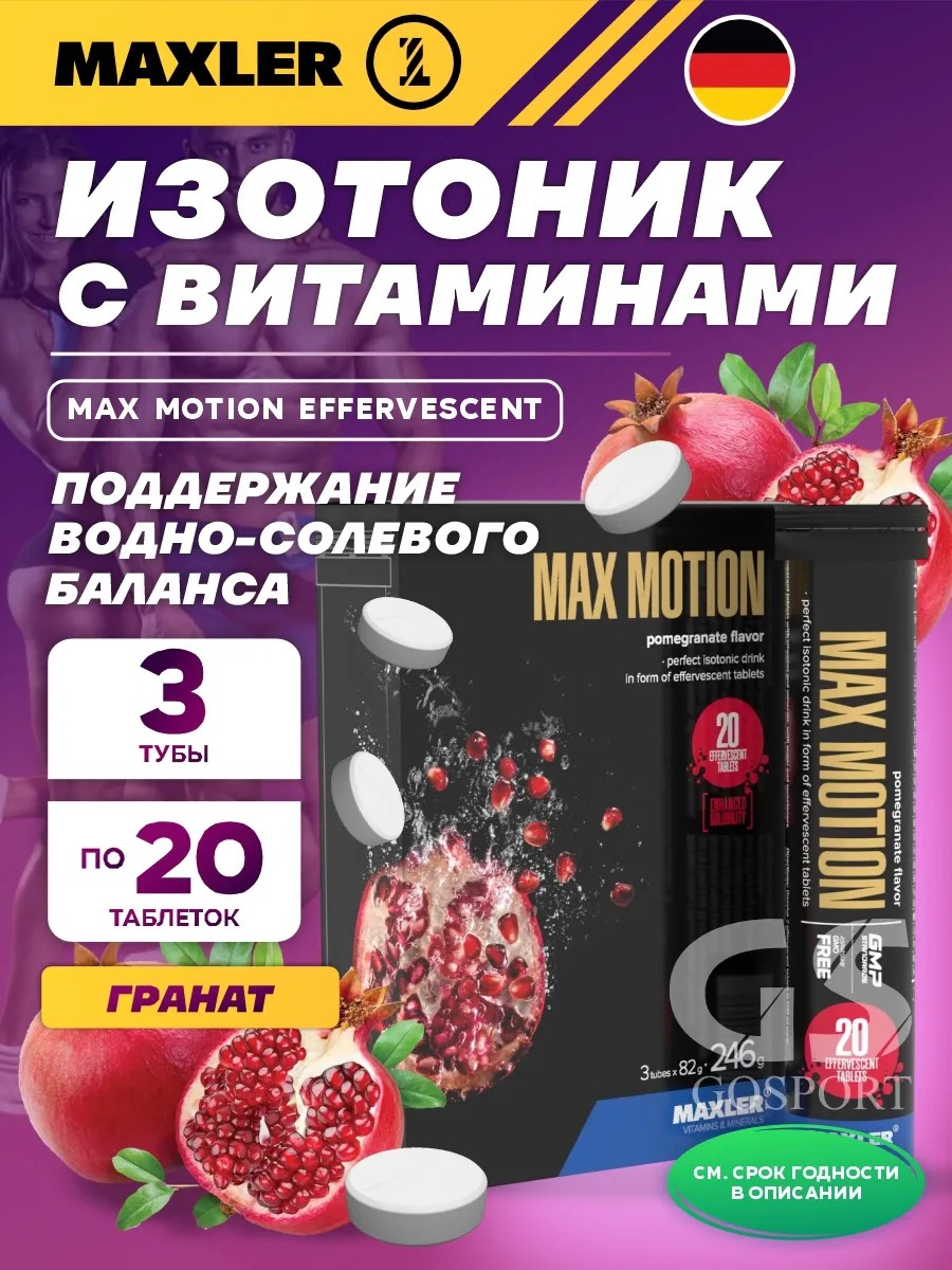 Expires until August 30, 2027. Max Motion Effervescent Isotonic Drink, 3x20 Effervescent Tablets, Pomegranate. Max Motion sports nutrition from Maxler is a complex of effervescent tablets with natural fruit flavors for making an isotonic drink. With each serving, you'll receive a blend of electrolytes and vitamins, which is always important during intense training or competition. Replenishing electrolytes helps maintain normal hydration and high performance. It's important to replace lost electrolytes, which this isotonic drink can do. It's easy to prepare. Simply dissolve two effervescent tablets in 500 ml of water, and you'll have a drink with valuable electrolytes to maintain normal hydration and high performance during training or competition. It can also help reduce recovery time after physical activity. This supplement not only helps increase endurance and energy but is also essential for maintaining good health. The component matrix of an isotonic drink is formed by minerals and vitamins. The mineral components are calcium, phosphorus, magnesium, and potassium. In our bodies, they act as electrolytes. Why do we need electrolytes? Electrolytes maintain the body's water-salt balance, which is important for normal muscle and nerve function. When fluid levels are within normal limits, the body better eliminates accumulated toxins and metabolic waste. An electrolyte deficiency can lead to muscle cramps and spasms, as well as muscle pain after physical exertion. In more severe cases, this can lead to fainting. Therefore, it is crucial to regularly replenish the electrolytes lost through sweat. This supplement also contains B vitamins, C, and E. B vitamins are essential for normal metabolism and energy exchange, for the effective functioning of the nervous and immune systems, and for combating fatigue. Vitamins C and E, as powerful antioxidants, improve the body's immune system. These components are not only an integral part of professional nutrition but also indispensable for your beauty and health. Isotonic Max Motion from Maxler will be your ideal companion during workouts, strength training, and fitness. It is equally suitable for both men and women. Directions for use: To prepare one serving, dissolve 2 effervescent tablets in 500 ml of water. Drink during physical activity.