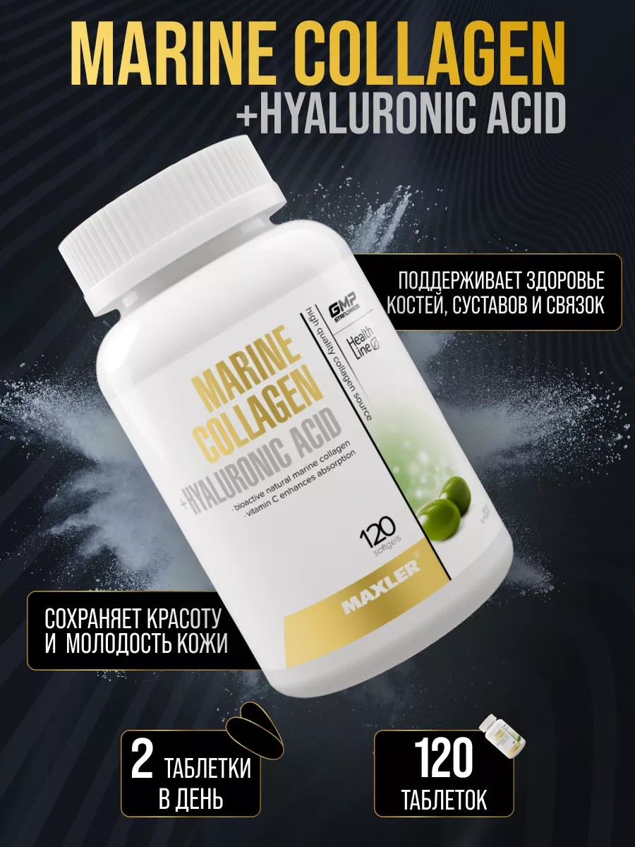 Maxler Marine Collagen + Hyaluronic Acid 120 шт. Эффективный уход за кожей предполагает не только использование косметических средств, но и регулярное насыщение организма необходимыми питательными веществами. Среди них особую важность имеют коллаген и гиалуроновая кислота, которые надолго поддерживают упругость и эластичность кожи благодаря сохранению влаги в организме.Коллаген – ключевой вид белка в организме, который составляет основу костей и кожи. Наиболее распространены морской и животный коллаген. По структуре морской коллаген является наиболее близким к человеческому и потому легче усваивается организмом и дает более выраженный эффект, чем животный.Уникальная формула Marine Collagen + Hyaluronic Acidот Maxler поможет Вам надолго сохранить красоту и молодость. В ее основе лежат высококачественный натуральный морской коллаген и гиалуроновая кислота в жидких формах, что значительно повышает их биодоступность. Софтгелевые капсулы окрашены натуральным хлорофиллом и обогащены витамином С, который улучшает усвоение коллагена. Комплекс не только эффективно восполняет нехватку коллагена и гиалуроновой кислоты, но и способствует выработке организмом их собственных запасов.1. Коллаген и гиалуроновая кислота сохраняют красоту и молодость кожи.Коллаген помогает организму бороться с возрастными изменениями благодаря увлажнению кожи, повышению ее эластичности, уменьшению проявлений морщин и улучшению структуры волос и ногтей. Ценные свойства коллагена дополняются действием гиалуроновой кислоты, которая эффективно восстанавливает и поддерживает водный баланс организма на клеточном уровне. Она воздействует как на поверхностные, так и на глубокие слои кожи, и стимулирует выработку собственного коллагена. Поэтому прием добавки Marine Collagen + Hyaluronic Acid позволит эффективно продлить молодость кожи.2. Коллаген и гиалуроновая кислота поддерживают здоровье костей, суставов и связок.Восполнение нехватки коллагена и гиалуроновой кислоты способствует укреплению соединительной ткани, что позволяет повысить прочность костей, а также эластичность связок и подвижность суставов. Коллаген препятствует разрушению хрящевой ткани, благодаря чему оказывает комплексную поддержку опорно-двигательному аппарату.3. Коллаген и гиалуроновая кислота способствуют заживлению и восстановлению кожи. Благодаря своим заживляющим свойствам коллаген в сочетании с гиалуроновой кислотой способствуют обновлению клеток кожи и скорейшему восстановлению после внешнего воздействия (пилинги, солнечные ожоги, косметические чистки). Также их прием в качестве добавки эффективно ускоряет послеоперационную реабилитацию.