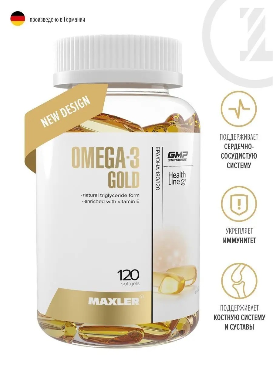 Maxler Omega-3 Gold 120шт – это жирные кислоты, неотъемлемо важные для поддержания и сохранения здоровья, молодости и работоспособности. Они оказывают комплексную поддержку всему организму, в особенности сердечно-сосудистой и иммунной системам, а также органам, которые отвечают за быструю передачу информации, - глазам и мозгу. Омега-3 не синтезируются организмом, поэтому их необходимо ежедневно добавлять в свой рацион. Жирные кислоты содержатся во многих продуктах, но особенно ими богаты свежая морская рыба и морепродукты. Однако зачастую организм не получает нужного количества Омеги-3 из пищи, поэтому их прием в качестве добавки считается наиболее эффективным.Maxler разработал Omega-3 Gold – добавку, содержащую 1000 мг высококачественного рыбьего жира в каждой капсуле, из которых 300 мг – Омега-3 (ЭПК/ДГК). Продукт содержит натуральную триглицеридную форму Омеги-3, которая легко усваивается благодаря особой технологии очистки. Капсулы обогащены натуральным витамином Е для лучшего усвоения активных веществ.Польза:1. Омега-3 стимулируют сердечно-сосудистую систему.Полезные жиры Омега-3 снижают уровень холестерина в крови, регулируют артериальное давление, нормализуют частоту пульса и укрепляют стенки сосудов, делая их эластичными. Поэтому жирные кислоты служат надежными защитниками здоровья сердечно-сосудистой системы.2. Омега-3 укрепляют иммунитет.Жиры Омега-3 составляют часть клеток иммунной системы и существенно повышают сопротивляемость организма вирусам и инфекциям. Также жирные кислоты являются мощными антиоксидантами и оказывают противовоспалительное действие.3. Омега-3 помогают справляться с умственными и зрительными нагрузками.Человеческий мозг на 60% состоит из жиров, и треть из них составляют жирные кислоты. Насыщение организма Омегой-3 помогает улучшить память и концентрацию внимания, повысить работоспособность и избавиться от ощущения сухости в глазах при высоких зрительных нагрузках.4. Омега-3 поддерживают здоровье костей, суставов и связок.Регулярное поступление Омеги-3 в организм оказывает эффективную поддержку костной системе и помогает бороться с воспалительными процессами в связках. Жирные кислоты улучшают подвижность суставов и препятствуют разрушению хрящевой ткани.Рекомендации по применению:Для комплексной поддержки организма принимайте добавку Omega-3 Gold по 1 капсуле от 1 до 3 раз в день, желательно во время еды. Максимальный эффект достигается благодаря регулярному приему Омеги-3 курсами продолжительностью от 2 до 3 месяцев. Сделайте жирные кислоты Омега-3 частью Вашего здорового рациона – и они помогут Вам сохранить молодость, здоровье и работоспособность на долгие годы.