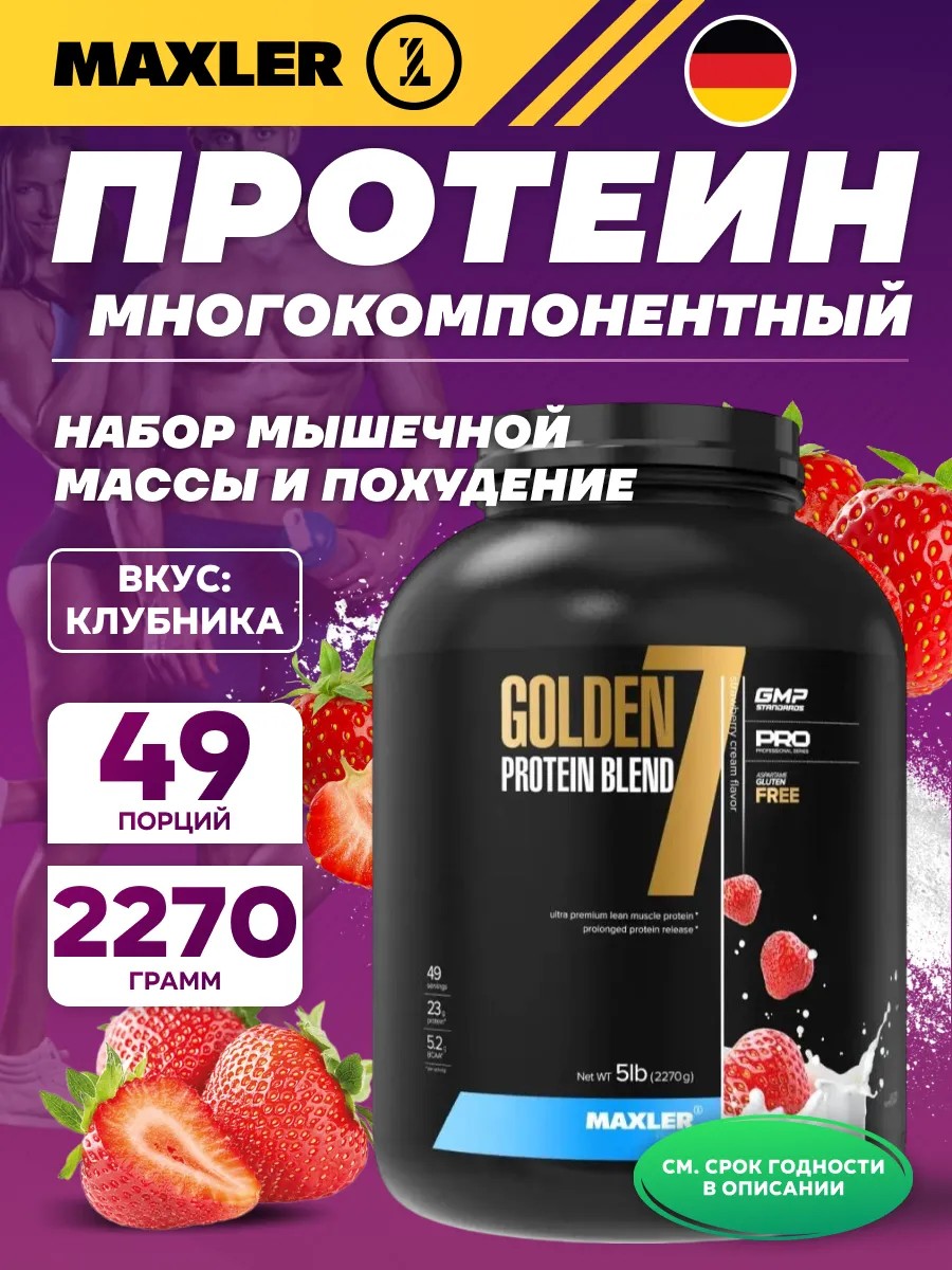 Годен до 31.05.2027. Комплексный протеин Golden 7 Protein Blend 2270 г, Клубника. Многокомпонентный протеин Golden 7 Protein Blend Maxler, который станет незаменимым помощником в достижении ваших спортивных целей. Протеин – это основной строительный материал для нашего организма. Он играет важнейшую роль в росте мышц и восстановлении организма после тренировок. Именно поэтому комплексный протеин является неотъемлемым компонентом профессионального спортивного питания для спортсменов и людей, занимающихся спортом. Комплексный протеин Golden 7 – это идеальный протеиновый коктейль для набора мышечной массы и роста мышц. В его составе содержится несколько типов белка высочайшего качества, что позволяет в одном коктейле получить все необходимые аминокислоты, для эффективного роста и восстановления мышц. Продукт подходит как мужчинам, так и женщинам, которые занимаются спортом, фитнесом и стремятся к достижению результатов. Комплексный протеин Golden 7 от Макслер является отличным дополнением к спортивному питанию для тех, кто хочет улучшить свою физическую форму, увеличить мышечную массу. Этот продукт также идеален для тех, кто хочет похудеть. Многокомпонентный протеин Golden 7 поможет вам контролировать аппетит благодаря высокому содержанию белка, который создает чувство сытости. Также он ускоряет обмен веществ, способствуя потере лишнего жира и сохранению сухой мышечной массы. Эта добавка восстанавливает организм после интенсивных тренировок, способствует росту мышц и повышает выносливость. Комплексный протеин Golden 7 – это не просто протеиновый напиток, а инновационный продукт для достижения ваших спортивных целей. Рекомендации к применению пищевой добавки: смешайте одну порцию (46 граммов) с 235 мл воды или молока.