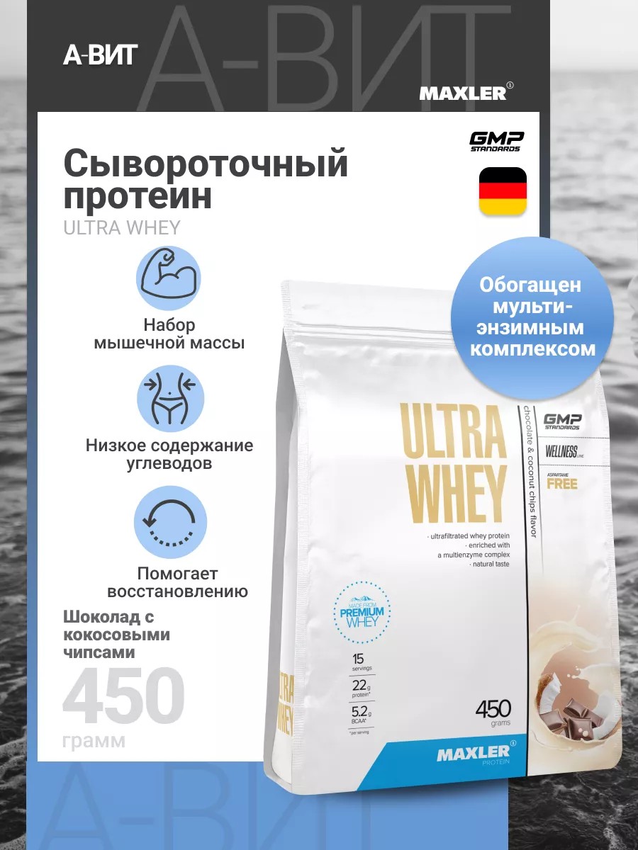 **Maxler Ultra Whey в пакете 450 гр со вкусом шоколад с кокосовыми чипсами ** - это 80% сывороточный протеин высочайшего качества, произведён из лучшего молока коров на свободном выпасе. Отличается крайне низким содержанием жира и углеводов. Продукт содержит 100% чистый концентрат, гидролизат и изолят сывороточного протеина, которые быстро усваиваются. Макслер Ультра Вей содержит аминокислоты с разветвленными боковыми цепями BCAA - крайне важные в жизни любого человека для быстрого восстановления мышц после нагрузок. Протеиновый коктейль для похудения будет очень приятным на вкус даже в случае разведения простой водой, для смешивания напитка лучше всего подойдет шейкер для протеина и спортивного питания. Ultra Whey содержит минимальное количество жиров и углеводов и максимальную концентрацию белка в каждой порции. В связи с этим добавку можно использовать как протеин для похудания. Его по достоинству оценят все взрослые женщины и мужчины. Белковый комплекс с БЦА станет отличным перекусом, более легким, чем протеиновый батончик или протеиновое печенье. Позволит даже без изнуряющих диет достичь быстрого снижения веса и наращивания мышечной массы. Предтренировочный концентрат выпускается в удобной банке с мерной ложкой для приготовления полезных напитков. Благодаря приему пищевой добавки при занятиях спортом отмечается сжигание калорий, рост мышц. Протеиновый коктель в форме порошка принесет огромную пользу женскому и мужскому организму, дополнит диетическое, сбалансированное и спортивное питание. При употреблении правильной, здоровой пищи он позволит девушкам и парням достичь превосходных результатов. Белок спортивный окажется незаменимым для спортсменов, он способствует быстрому восстановлению после тренировок и станет отличным помощником для набора массы. Добавка с уникальным составом повысит эффективность занятий спортом, поможет улучшить общее состояние здоровья и восполнить дефицит белка в организме.**Рекомендации по применению:** растворите 1 порцию в 250мл воды