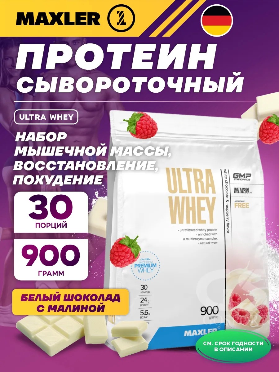 Годен до 31.08.2026. Сывороточный протеин Ultra Whey 900 г, Малина-белый шоколад. Сывороточный протеин высочайшего качества Ultra Whey от Maxler, станет незаменимым помощником в достижении ваших спортивных целей. Протеин – это основной строительный материал для нашего организма. Он играет важнейшую роль в росте мышц и восстановлении организма после тренировок. Именно поэтому сывороточный протеин является неотъемлемым компонентом спортивного питания для профессиональных спортсменов и людей, занимающихся спортом. Сывороточный протеин – это идеальный протеиновый коктейль для набора мышечной массы и роста мышц. Сывороточный протеин от Макслер содержит все необходимые аминокислоты, которые способствуют быстрому восстановлению мышц и стимулируют их рост. Продукт подходит как мужчинам, так и женщинам, которые занимаются спортом и стремятся к достижению результатов. Сывороточный протеин является отличным дополнением к спортивному питанию для тех, кто хочет улучшить свою физическую форму, увеличить мышечную массу. Этот продукт также идеален для тех, кто хочет похудеть. Сывороточный протеин поможет вам контролировать аппетит благодаря высокому содержанию белка, который создает чувство сытости. Также он ускоряет обмен веществ, способствуя потере лишнего жира и сохранению сухой мышечной массы. Эта добавка восстанавливает организм после интенсивных тренировок, способствует росту мышц и повышает выносливость. сывороточный протеин - это не просто напиток, а инновационный продукт для достижения ваших спортивных целей. Рекомендации по применению: смешайте 1 порцию (30 г) с 250 мл воды или молока.