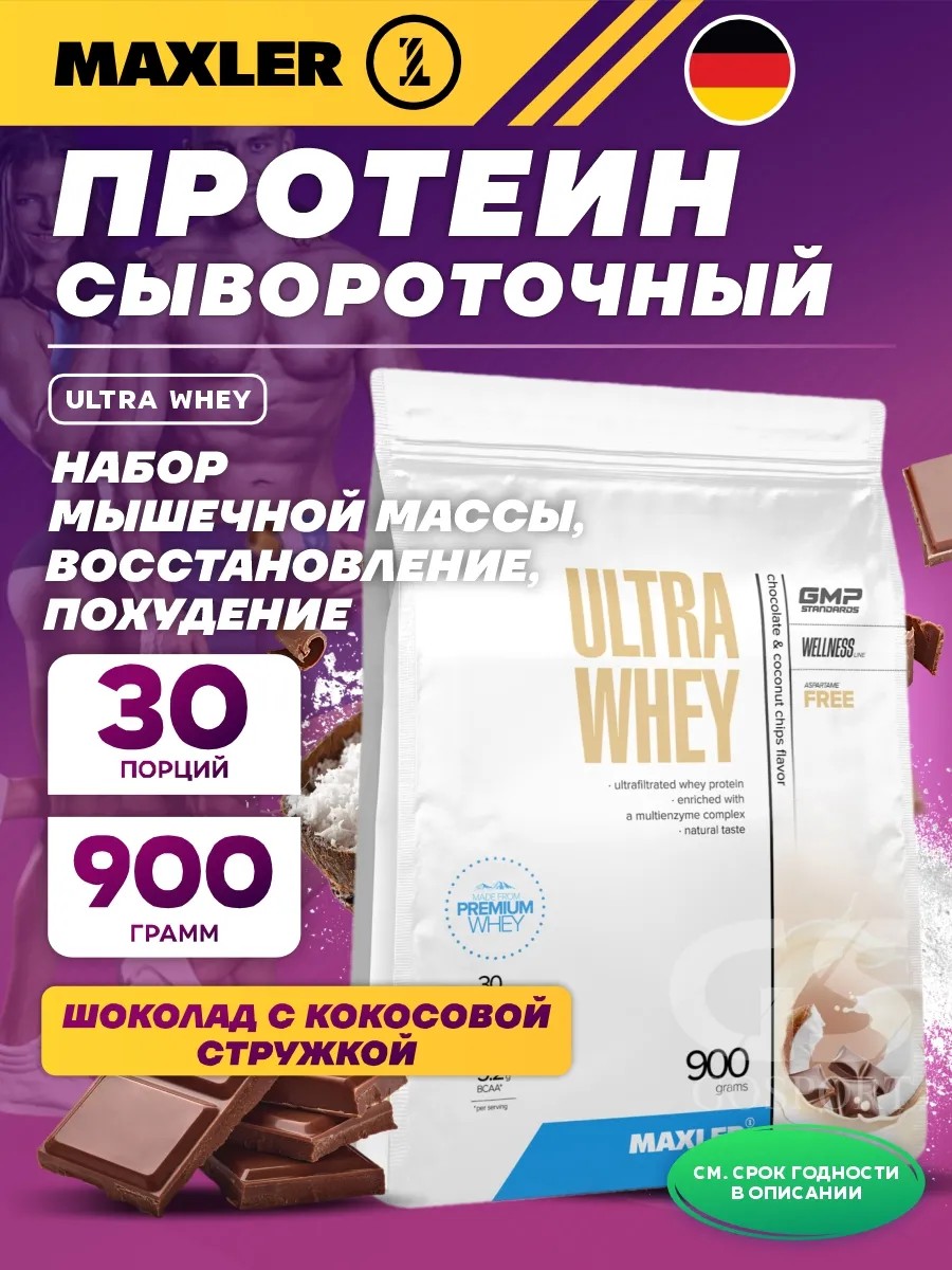 Сывороточный протеин Ultra Whey 900 г, Шоколад с кокосовой стружкой. Сывороточный протеин высочайшего качества Ultra Whey от Maxler, станет незаменимым помощником в достижении ваших спортивных целей. Протеин – это основной строительный материал для нашего организма. Он играет важнейшую роль в росте мышц и восстановлении организма после тренировок. Именно поэтому сывороточный протеин является неотъемлемым компонентом спортивного питания для профессиональных спортсменов и людей, занимающихся спортом. Сывороточный протеин – это идеальный протеиновый коктейль для набора мышечной массы и роста мышц. Сывороточный протеин от Макслер содержит все необходимые аминокислоты, которые способствуют быстрому восстановлению мышц и стимулируют их рост. Продукт подходит как мужчинам, так и женщинам, которые занимаются спортом и стремятся к достижению результатов. Сывороточный протеин является отличным дополнением к спортивному питанию для тех, кто хочет улучшить свою физическую форму, увеличить мышечную массу. Этот продукт также идеален для тех, кто хочет похудеть. Сывороточный протеин поможет вам контролировать аппетит благодаря высокому содержанию белка, который создает чувство сытости. Также он ускоряет обмен веществ, способствуя потере лишнего жира и сохранению сухой мышечной массы. Эта добавка восстанавливает организм после интенсивных тренировок, способствует росту мышц и повышает выносливость. сывороточный протеин - это не просто напиток, а инновационный продукт для достижения ваших спортивных целей. Рекомендации по применению: смешайте 1 порцию (30 г) с 250 мл воды или молока.