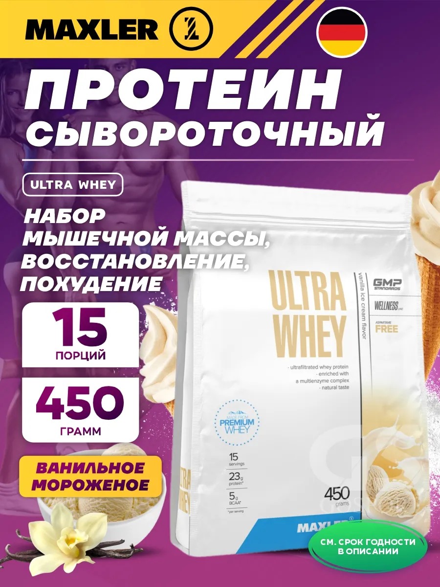 Годен до 23.02.2027. Сывороточный протеин Ultra Whey 450 г, Ванильное мороженное. Сывороточный протеин высочайшего качества Ultra Whey от Maxler, станет незаменимым помощником в достижении ваших спортивных целей. Протеин – это основной строительный материал для нашего организма. Он играет важнейшую роль в росте мышц и восстановлении организма после тренировок. Именно поэтому сывороточный протеин является неотъемлемым компонентом спортивного питания для профессиональных спортсменов и людей, занимающихся спортом. Сывороточный протеин – это идеальный протеиновый коктейль для набора мышечной массы и роста мышц. Сывороточный протеин от Макслер содержит все необходимые аминокислоты, которые способствуют быстрому восстановлению мышц и стимулируют их рост. Продукт подходит как мужчинам, так и женщинам, которые занимаются спортом и стремятся к достижению результатов. Сывороточный протеин является отличным дополнением к спортивному питанию для тех, кто хочет улучшить свою физическую форму, увеличить мышечную массу. Этот продукт также идеален для тех, кто хочет похудеть. Сывороточный протеин поможет вам контролировать аппетит благодаря высокому содержанию белка, который создает чувство сытости. Также он ускоряет обмен веществ, способствуя потере лишнего жира и сохранению сухой мышечной массы. Эта добавка восстанавливает организм после интенсивных тренировок, способствует росту мышц и повышает выносливость. сывороточный протеин - это не просто напиток, а инновационный продукт для достижения ваших спортивных целей. Рекомендации по применению: смешайте 1 порцию (30 г) с 250 мл воды или молока.
