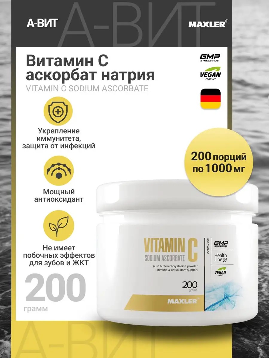 Витамины Maxler Vitamin С Sodium Ascorbate 1000 мг в порошке. Витамин С Maxler является сильным антиоксидантом, который может укрепить иммунитет организма. Витамин С макслер необходим для поддержания здоровья кожи, костей, зубов, связок и кровеносных сосудов. Витамин С порошок необходим организму для синтеза коллагена, а также он способствует усваиванию нутриентов, которые мы получаем с пищей. Аскорбат натрия - форма витамина С, которая характеризуется большей биодоступностью и отличается от другой формы витамина ц - аскорбиновой кислоты, которая может вызывать расстройство желудка у некоторых людей. Также витамин С является антиоксидантом, который помогает защищать клетки организма от повреждений и играет важную роль в поддержании здоровья иммунной системы. Витаминный комплекс Vitamin C Maxler без вкуса :- повышает защитные силы организма, сохраняет красоту и молодость кожи, укрепляет сердечно-сосудистую систему, поддерживает здоровье зубов, не имеет побочных эффектов для желудка и почек. **Рекомендации по применению:** Принимайте 1 порцию (1 грамм).- 200 порций.