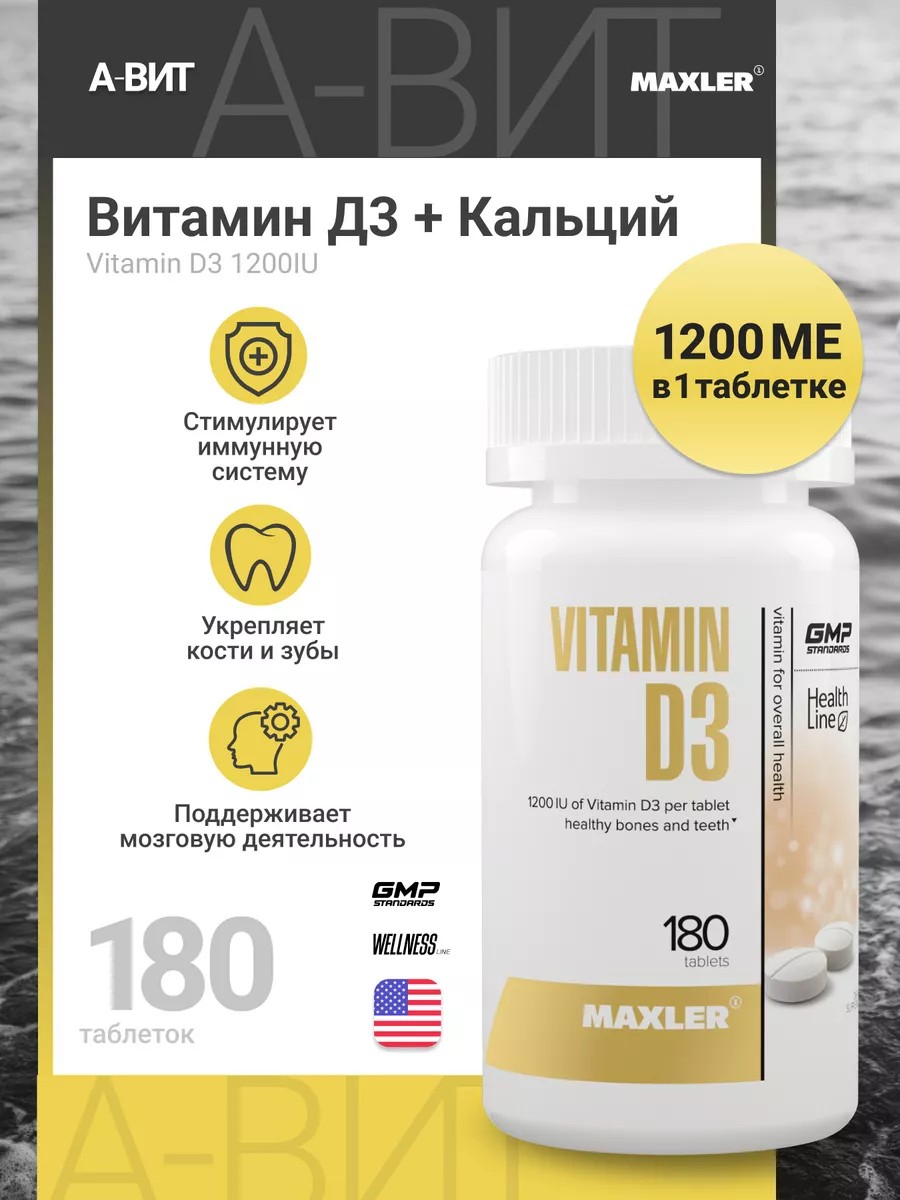 **Витамин Д3 Maxler 180 таблеток** стимулирует иммунную систему. Достаточный уровень витамина Д3 Макслер необходим для работы иммунной системы. Витамин D3 активизирует синтез протеинов, которые уничтожают вредные микроорганизмы. Т.е если Витамина Д3 недостаточно, то иммунная система не способна бороться с микроорганизмами, и человек заболевает. Также, витамин Д3 способен снижать хронические воспаления и риск сердечно-сосудистых заболеваний. Наиболее простой и действенный способ восполнить запасы витамина Д3 - это биологическая активная добавка от Maxler Vitamin D3. Витамин Д для зубов и костей. Витамин Д3 способствует усвоению кальция и фосфора, которые необходимы для крепких и здоровых костей и зубов. При нехватке Д3 кальций вымывается из организма, что может привести к переломам. Витамин Д для мозга. Достаточное количество Д3 в организме повышает когнитивные функции, улучшает память, помогает справиться со стрессами и тревожностью. **Рекомендации по применению:** принимайте по 1 таблетке в день, желательно во время еды. Таблетка имеет разделительную риску для того, чтобы вам легко было уменьшить дозу препарата, ориентируясь под нужды вашего организма.