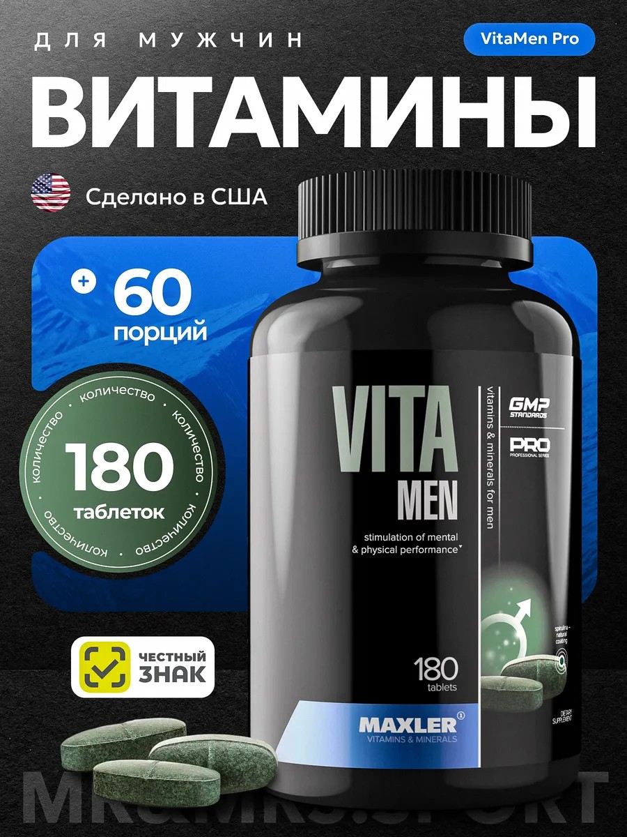 Витамины для мужчин Maxler VitaMen 180 шт США. Созданный специально для мужчин витаминно-минеральный комплекс, состоящий из ключевых минералов и экзотических фитодобавок Maxler Vita Men / Макслер Вита Мен способствует улучшению умственной и физической активности, здоровью простаты, снижает негативные последствия стресса и нормализует функцию пищеварительной системы. Спортивные витамины для мужчин Maxler VitaMen снабжают ваш организм важными и быстроусваиваемыми аминокислотами, которые способствуют росту мышц и их восстановлению. Данный продукт содержит высокие спортивные дозировки витаминов.