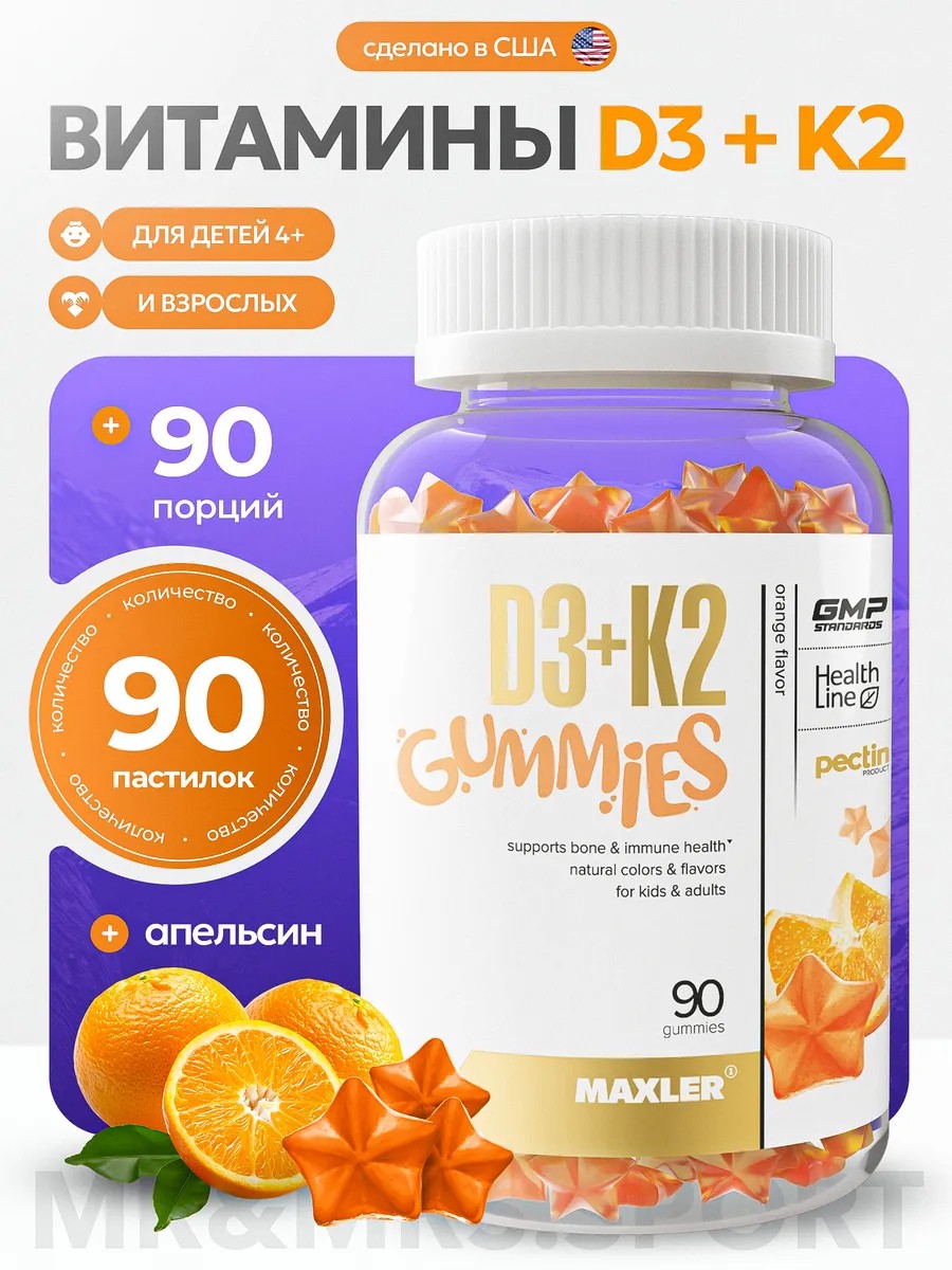 Витамины для детей Макслер D3+K2 Гаммиес 90 шт со вкусом Апельсина. Укрепляйте здоровье с помощью восхитительных D3+K2 gummiesДля поддержания хорошего состояния здоровья человеку необходимо поступление достаточного количества витаминов и питательных веществ. При правильном питании все нужные вещества пополняются сами собой, в том числе незаменимые витамины D и K. Первый берется из жирной рыбы, яичных желтков и вырабатывается организмом под воздействием солнечных лучей. Второй можно найти в курице, свинине, говядине, сыре, молоке и яичных желтках, причем важно, чтобы продукты были от животных, которых кормили зеленой травой. Преградами на пути осуществления принципов правильного питания на практике являются, например, сезонность продуктов питания, в частности овощей и фруктов, высокая занятость, особые потребности в питании, такие как особые диеты или аллергия, а также множество других факторов. Отличным способом добавить в рацион нужные витамины может стать прием витаминов D3+K2 в виде добавки.Польза Maxler D3+K2 gummies для организмаСочетание этих двух витаминов оказывает положительное влияние на все системы организма.Cпособствуют здоровью костей и зубов, укрепляют иммунитет, поддерживают мышечный тонус, помогают работе сердца.Витамин D3 способствует лучшему усвоению кальция и фосфора, тем самым поддерживая здоровье костей, зубов и мышц. Кроме того, витамин D3 помогает иммунной системе выполнять свои защитные функции и способствует росту мышечной ткани.Для того чтобы витамин D3 мог лучше выполнять свою задачу, ему необходим витамин K2. Кальций имеет тенденцию откладываться на стенках кровеносных сосудов, уменьшая их проницаемость. Витамин К2 гарантирует, что высвободившийся кальций попадет туда, куда нужно - в клетки мышц и костей. Отсюда вытекает последний пункт списка - поддержка здоровья сердца. Более того, в комплексе используются биодоступные формы витаминов, чтобы вы могли получить максимальную пользу от каждой пастилки.Яркий вкус апельсина гарантирует, что это полезное лакомство понравится и детям, и взрослым.D3+K2 gummies - идеальная добавка для взрослых и детей, ведущих активный образ жизни.Рекомендации по применению: взрослым и детям старше 4 лет принимать 1-3 жевательные конфеты один раз в день. Принимайте в любое время в течение дня. Размер порции должен основываться на вашем общем рационе и потребности в дополнительных витаминах.