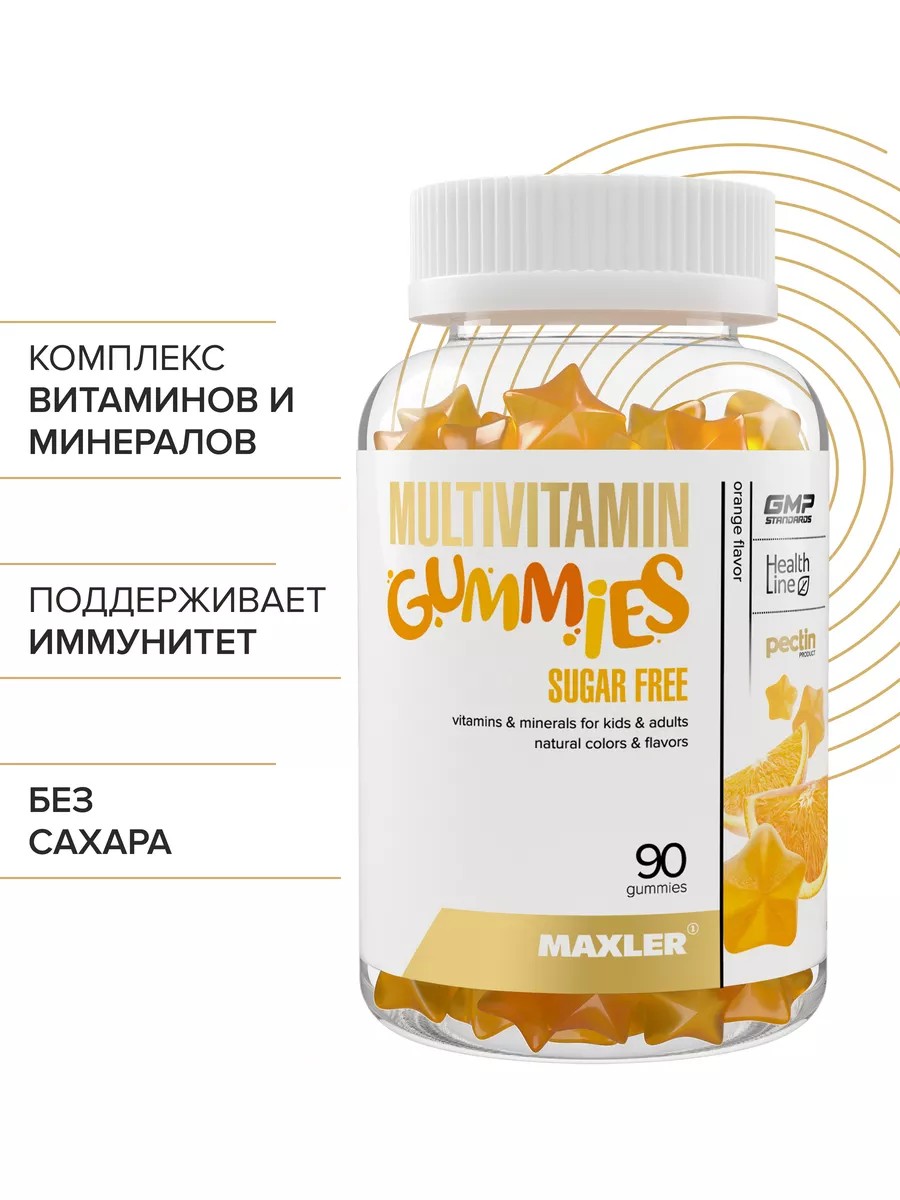Maxler Multivitamin Gummies SUGAR FREE 90шт Апельсин Для поддержания хорошего здоровья людям необходимо получать достаточное количество витаминов и питательных веществ. Сбалансированное питание служит естественным источником этих микроэлементов. Препятствиями для внедрения правильного питания на практике являются, например, сезонность продуктов, особенно фруктов и овощей, напряженный график работы и многие другие факторы. Прием витаминов в виде добавок может стать отличным способом добавить необходимые питательные вещества в свой рацион.Что особенного в Maxler Multivitamin Gummies Sugar Free?Multivitamin Gummies Sugar Free содержат биодоступные необходимые питательные вещества для восстановления клеток, восполнения энергии и здорового метаболизма для поддержки естественного иммунитета вашего организма.Витамин A принимает участие в формировании костной системы, зубов, в росте новых клеток. Он оказывает благотворное влияние на улучшение зрения. Витамин Е помогает витамину А лучше усваиваться организмом. Витамин С играет исключительную роль в укреплении и поддержке иммунитета. Витамины А, С и Е являются мощными антиоксидантами – защищают клетки от повреждений, вызываемых действием свободных радикалов.Витамин Д3 способствует здоровью костей, мышц и зубов. Он поддерживает нормальное функционирование иммунитета, увеличивая сопротивляемость организма различным заболеваниям. Витамин В5 ускоряет регенерацию тканей. Витамин В6 необходим для углеводного обмена и вместе с витамином В12 участвует в работе нервной системы. Витамин В7 необходим для нормального метаболизма углеводов, протеинов и жиров в организме. Витамин В8 и Холин важны для работы мозга, особенно памяти и концентрации внимания. Витамин В9 необходим для роста новых клеток, играет важную роль в поддержании мышечного тонуса в желудочно-кишечном тракте, функционировании нервной системы.Кроме пользы для здоровья, Multivitamin gummies Sugar Free обладают потрясающим вкусом апельсина, который никого не оставит равнодушным. Витаминно-минеральный комплекс Multivitamin gummies Sugar Free – идеальная добавка для взрослых и детей, ведущих активный образ жизни.Витамины и минералы уравновешивают друг друга, например, витамин А усиливает действие витаминов С и Е и цинка. Витамин В6 усиливает действие цинка, а йод лучше усваивается вместе с витаминами A, C, Д и Е. Макслер объединил ингредиенты в одну мощную формулы, чтобы вы получали максимум пользы каждый день!
