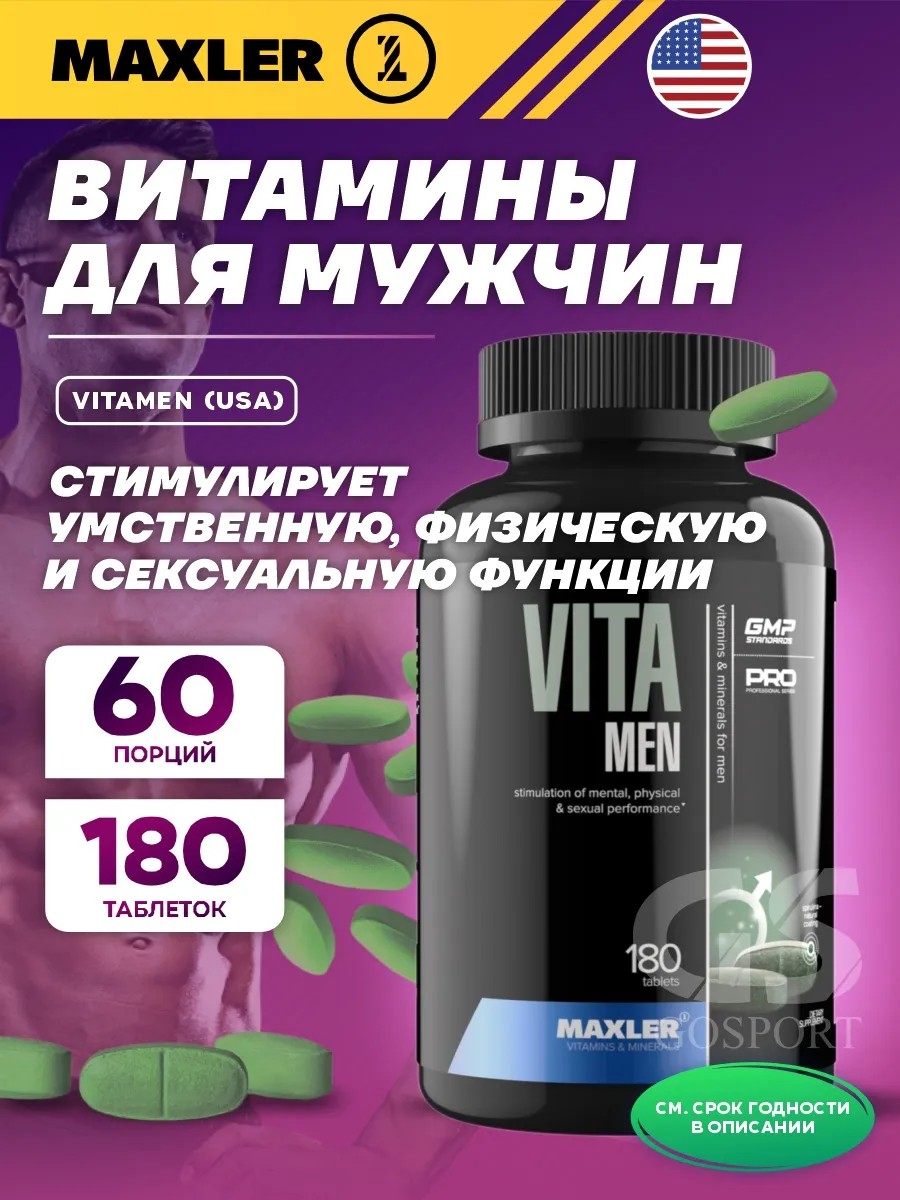 Годен до 31.07.2028. Витамины для мужчин VitaMen (USA) 180 таблеток. Вы пытаетесь сбалансировать активный образ жизни и успех на работе? Когда вы пытаетесь получить все это, вам нужна вся возможная поддержка. Вот почему так важно соблюдать здоровую диету, которая обеспечивает организм всеми микроэлементами, необходимыми для оптимальной производительности, будь то в тренажерном зале, на работе или дома. Vita Men — это смесь определенных ключевых минералов и экзотических фитонутриентов, разработанная специально для мужчин, чтобы усилить ваши мужские качества. Vita Men может стать вашим надежным спутником, помогающим в выздоровлении и повышающим вашу энергию. Витаминно-минеральный комплекс Vita Men сочетает в себе 13 витаминов и 9 минералов с множеством дополнительных полезных компонентов, которые имеют множество преимуществ для вашего здоровья, концентрации, работоспособности и общего самочувствия: поддержание здоровья простаты: экстракт ягод пальметто, ликопин, лютеин и корень крапивы помогают улучшить здоровье простаты. Повышение сексуальной функции: лист дамианы является сексуальным стимулятором и афродизиаком. Семена тыквы и ликопин помогают улучшить фертильность у мужчин. Улучшение когнитивных функций. Корейский женьшень помогает повысить внимательность, а экстракт овсяной соломы помогает улучшить настроение и работу мозга. Холин — питательное вещество для мозга, которое помогает улучшить настроение и память. Пищеварительная смесь – для поддержки кишечника и пищеварения эта формула содержит ферменты, которые помогают переваривать белки, углеводы, жиры и клетчатку. Витаминный комплекс Vita Men содержит множество ингредиентов, обладающих антиоксидантными свойствами или способствующих укреплению иммунитета, таких как дезодорированный чеснок, цитрусовые биофлавонолы и L-глутатион. В состав Vita Men Maxler входят не только витамины и минералы, необходимые для наращивания мышечной массы, но также смесь аминокислот, которая поможет вам достичь ваших целей по потреблению белка. Другие компоненты, такие как ликопин, помогают повысить уровень тестостерона, что облегчает наращивание мышечной массы. Vita Men от Макслер может стать полезным компонентом профессионального спортивного питания для спортсменов и людей, занимающихся спортом или фитнесом. Рекомендации к применению пищевой добавки: принимайте по три таблетки в день, желательно во время еды.