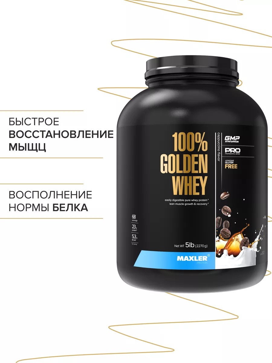Maxler 100% Golden Whey 2270 г со вкусом Капучино. УВАЖАЕМЫЕ ПОКУПАТЕЛИ !!! Продукты из новых партий имеют новые мембраны с заводскими технологическими отверстиями. Также бренд может отказываться от индивидуально разработанной упаковки и использовать стандартные компоненты упаковки в 100% Golden Whey - без гравировки логотипа Maxler на крышках и ложках. При этом вы можете быть уверенными, что данный продукт является 100% аутентичным продуктом Maxler. Данная информация также указана на официальном сайте бренда.100% Golden Whey Cappuccino 5lb – это чистый сывороточный белок премиум класса, который идеален в период повышенных физических нагрузок. Продукт содержит Whey Protein Blend - 100% чистый концентрат, изолят и гидролизат сывороточного протеина, которые быстро усваиваются. Незаменим в период интенсивных тренировок, когда необходимо увеличить потребление белка для поддержки положительного баланса азота и насыщения мышц необходимыми для роста аминокислотами. 100% Golden Whey обогащен незаменимыми аминокислотами с разветвленными боковыми цепями (BCAA) для быстрого восстановления мышечной ткани после тренировок.Рекомендации по применению: для получения одной порции смешайте 33 г порошка (1 мерную ложку) с 180-240 мл воды, молока или вашего любимого напитка. Для достижения желаемой консистенции можно варьировать количество жидкости. Для удобства приготовления коктейля рекомендуем воспользоваться фирменным шейкером для спорт пита. Выбирая Maxler, вы выбираете качество.