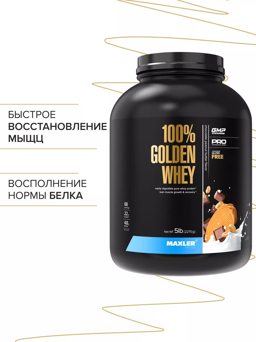 Maxler 100% Golden Whey 2270 г со вкусом Шоколадно-Арахисовая Паста. УВАЖАЕМЫЕ ПОКУПАТЕЛИ !!! Продукты из новых партий имеют новые мембраны с заводскими технологическими отверстиями. Также бренд может отказываться от индивидуально разработанной упаковки и использовать стандартные компоненты упаковки в 100% Golden Whey - без гравировки логотипа Maxler на крышках и ложках. При этом вы можете быть уверенными, что данный продукт является 100% аутентичным продуктом Maxler. Данная информация также указана на официальном сайте бренда.100% Golden Whey Chocolate Peanut Butter 5lb – это чистый сывороточный белок премиум класса, который идеален в период повышенных физических нагрузок. Продукт содержит Whey Protein Blend - 100% чистый концентрат, изолят и гидролизат сывороточного протеина, которые быстро усваиваются.
