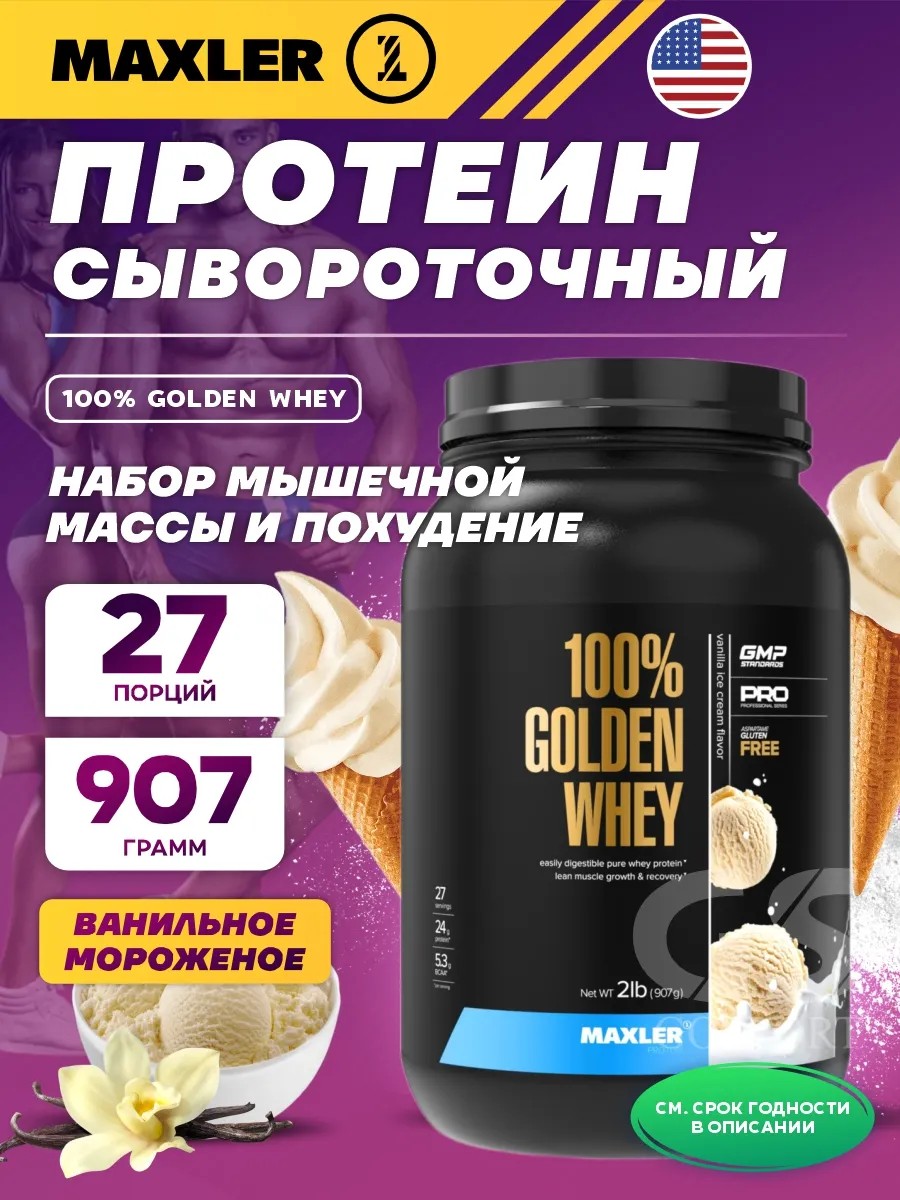Годен до 31.03.2027. Сывороточный протеин 100% Golden Whey 907 г, Ванильное мороженое. Maxler 100% Golden Whey - этот продукт содержит 100% ультрафильтрованный сывороточный протеин, чтобы вы могли достичь максимальных результатов. Продукт состоит только из 100% чистого концентрата, изолята и гидролизата сывороточного протеина. Эти ключевые ингредиенты быстро усваиваются организмом, обеспечивая его важным белком. Maxler 100% Golden Whey - это не просто протеиновый напиток. Это профессиональное спортивное питание, которое помогает не только увеличить мышечную массу, но и сжечь жир, достичь максимальных результатов в тренировках и обеспечить восстановление мышц после активных физических нагрузок. Благодаря своим уникальным свойствам, протеиновый коктейль идеально подходит для тех, кто стремится к похудению и набору мышечной массы. Богатый белком, Maxler 100% Golden Whey является незаменимым продуктом для спортсменов, которые стремятся повысить свою силу, выносливость и контроль веса. Не упустите возможность добавить эту пищевую добавку в свою тренировочную программу! Maxler 100% Golden Whey - это мощный инструмент для наращивания мышц, как для мужчин, так и для женщин. Независимо от ваших фитнес-целей - будь то качество тела или сушка - Maxler 100% Golden Whey поможет вам достичь ваших максимальных результатов. Кроме того, этот протеиновый порошок обеспечивает важные незаменимые аминокислоты, которые необходимы для восстановления после тренировок. Он также способствует увеличению обмена веществ и обеспечивает необходимую энергию для активных физических нагрузок. Макслер 100% Голден Вей - это ваш идеальный выбор для достижения ваших фитнес-целей. Включите его в свою диету прямо сейчас и узнайте, как это может изменить ваш физический потенциал. Рекомендации по применению: для получения одной порции смешайте 33 г порошка (1 мерную ложку) с 180-240 мл воды, молока или вашего любимого напитка. Для достижения желаемой консистенции можно варьировать количество жидкости.