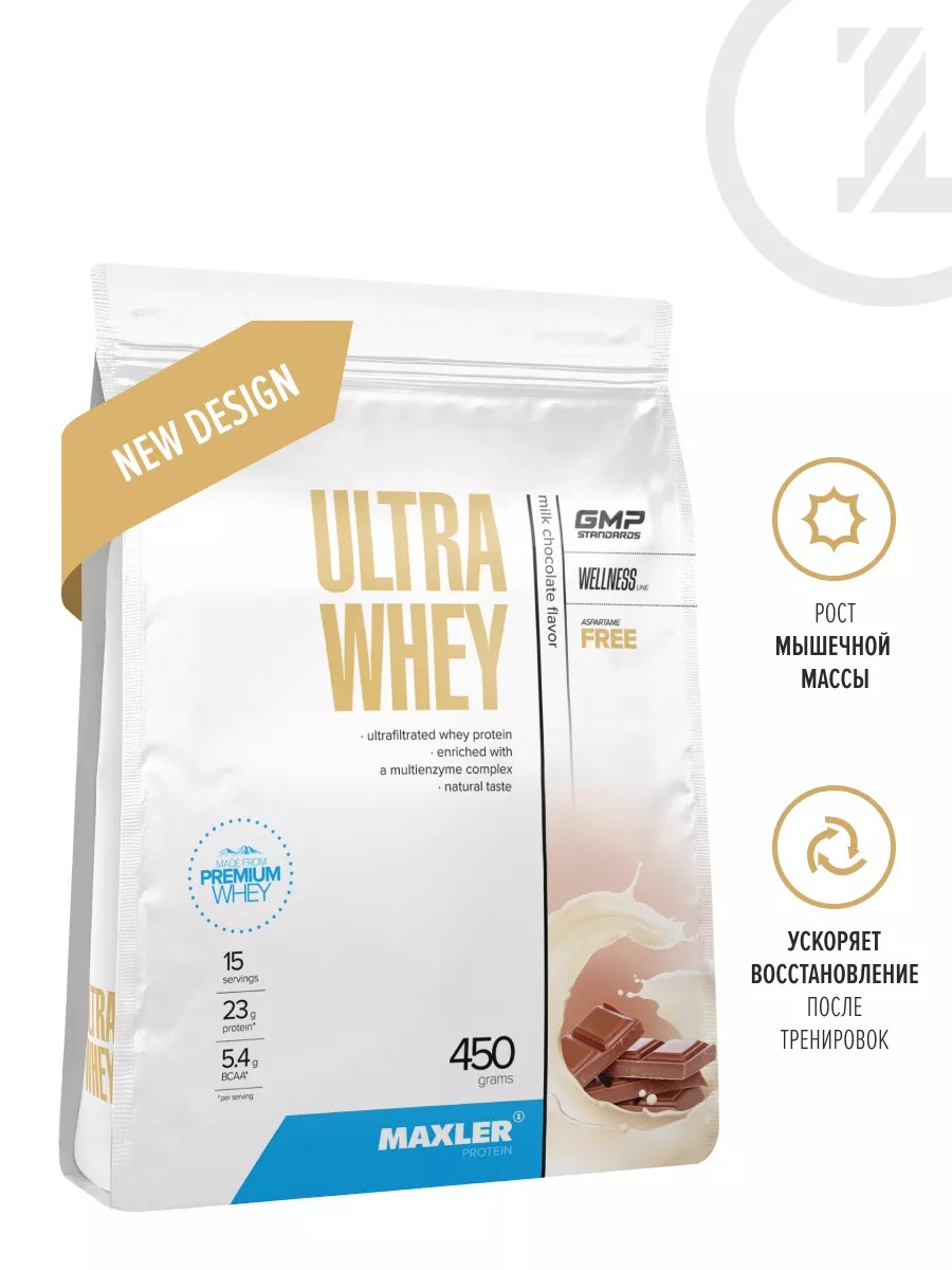Сывороточный протеин Maxler Ultra Whey 450 г Молочный Шоколад содержит 22 г белка на порцию, обогащен мультиферментным комплексом, полный спектр аминокислот. Наш организм не может существовать без белков и аминокислот. Белки нужны ему для построения мышц, здорового гормонального баланса и выработки энзимов (или ферментов), ускоряющих обмен веществ. Организм должен получать их через богатую белками пищу.Лучшие ингредиенты для лучших результатов Ultra Whey – это 80%ый сывороточный протеин высочайшего качества из натуральных ингредиентов. Это обеспечивает быстрое всасывание белка в кровь. Мы получаем его из молока коров на свободном выпасе, поэтому Ultra Whey содержит низкий уровень жиров и углеводов. Продукт также включает в себя все 9 незаменимых аминокислот, которые помогают строить новые мышцы и способствуют восстановлению. Какие 9 незаменимых аминокислот содержит Ultra Whey, и как они влияют на ваш организм? Изолейцин, лейцин и валин способствуют восстановлению и вместе образуют комплекс, широко известный как BCAA. Он всасывается непосредственно в мышечную ткань, помогая восстановить ее после тяжелой тренировки. Гистидин вступает в реакцию с бета-аланином, образуя L-карнозин – незаменимое соединение для тех, кто хочет долго тренироваться без усталости: он уменьшает накопление молочной кислоты, которая затрудняет длительные физические нагрузки. Лизин составляет 1/3 компонента, необходимого для построения коллагена – белка, отвечающего за рост костной и мышечной ткани, эластичность кожи, здоровые волосы и ногти. Метионин помогает создавать другие аминокислоты и участвует в расщеплении жиров. Фенилаланин, наряду с тирозином, помогает синтезировать дофамин и серотонин – гормоны счастья. Треонин, как и лизин, поддерживает иммунную систему: он помогает вырабатывать антитела, что позволяет ей лучше справляться с инфекциями. Триптофан вместе с белком помогают вам оставаться энергичными и активными. Аминокислоты участвуют во всех важных процессах в организме, но их сочетание с физической активностью оказывает уникальный эффект на рост мышц. Ведь мышцы почти полностью состоят из белка, который, в свою очередь, состоит из аминокислот. Ultra Whey легко усваивается благодаря мультиэнзимному комплексу DigeZyme. Более того, он обладает целым рядом удивительных вкусов, которые никого не оставят равнодушным. Теперь каждый протеиновый коктейль будет сладким и вкусным, но не приторным, насыщающим, но легким.Вашим мышцам, не меньше чем вам самим, нужно правильно питаться, отдыхать и восстанавливаться. Уникальная формула Ultra Whey помогает со всем этим без лишних хлопот. Макслер Ультра Вей идеально подходит для спортсменов и просто активных людей, для мужчин и для женщин, которые заботятся о своем здоровье и питании и нуждаются в дополнительном источнике белка. Рекомендации по применению Maxler Ultra Whey Milk Chocolate: смешайте 2 мерных ложки протеина (30 г.) с 250 мл. воды или молока.