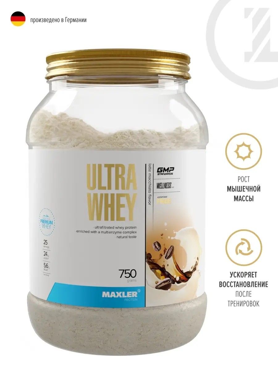 Сывороточный протеин Ultra Whey 750g Латте Макиато содержит 22 г белка на порциюобогащен мультиферментным комплексомполный спектр аминокислот.Наш организм не может существовать без белков и аминокислот. Белки нужны ему для построения мышц, здорового гормонального баланса и выработки энзимов (или ферментов), ускоряющих обмен веществ. Организм должен получать их через богатую белками пищу.Лучшие ингредиенты для лучших результатовUltra Whey – это 80%ый сывороточный протеин высочайшего качества из натуральных ингредиентов. Это обеспечивает быстрое всасывание белка в кровь. Мы получаем его из молока коров на свободном выпасе, поэтому Ultra Whey содержит низкий уровень жиров и углеводов. Продукт также включает в себя все 9 незаменимых аминокислот, которые помогают строить новые мышцы и способствуют восстановлению.Какие 9 незаменимых аминокислот содержит Ultra Whey, и как они влияют на ваш организм?Изолейцин, лейцин и валин способствуют восстановлению и вместе образуют комплекс, широко известный как BCAA. Он всасывается непосредственно в мышечную ткань, помогая восстановить ее после тяжелой тренировки.Гистидин вступает в реакцию с бета-аланином, образуя L-карнозин – незаменимое соединение для тех, кто хочет долго тренироваться без усталости: он уменьшает накопление молочной кислоты, которая затрудняет длительные физические нагрузки.Лизин составляет 1/3 компонента, необходимого для построения коллагена – белка, отвечающего за рост костной и мышечной ткани, эластичность кожи, здоровые волосы и ногти.Метионин помогает создавать другие аминокислоты и участвует в расщеплении жиров.Фенилаланин, наряду с тирозином, помогает синтезировать дофамин и серотонин – гормоны счастья.Треонин, как и лизин, поддерживает иммунную систему: он помогает вырабатывать антитела, что позволяет ей лучше справляться с инфекциями.Триптофан вместе с белком помогают вам оставаться энергичными и активными.Аминокислоты участвуют во всех важных процессах в организме, но их сочетание с физической активностью оказывает уникальный эффект на рост мышц. Ведь мышцы почти полностью состоят из белка, который, в свою очередь, состоит из аминокислот.Ultra Whey легко усваивается благодаря мультиэнзимному комплексу DigeZyme. Более того, он обладает целым рядом удивительных вкусов, которые никого не оставят равнодушным. Теперь каждый протеиновый коктейль будет сладким и вкусным, но не приторным, насыщающим, но легким.Вашим мышцам, не меньше чем вам самим, нужно правильно питаться, отдыхать и восстанавливаться. Уникальная формула Ultra Whey помогает со всем этим без лишних хлопот.Maxler Ultra Whey Latte Macchiato идеально подходит для спортсменов и просто активных людей, для мужчин и для женщин, которые заботятся о своем здоровье и питании и нуждаются в дополнительном источнике белка. Рекомендации по применению Макслер Ультра Вей : смешайте 1 мерную ложку протеина (30 г.) с 250 мл. воды или молока.