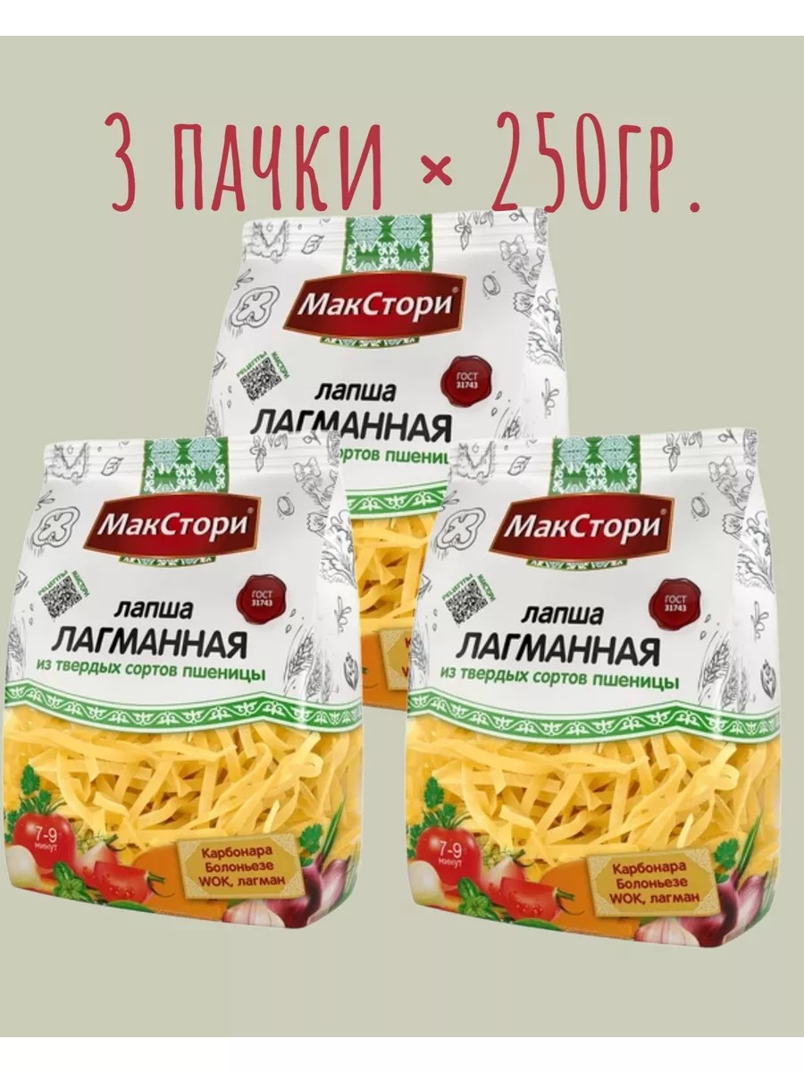 КомплектацияЛапша лагманная из твердых сортов пшеницы 3 шт.× 250гр.