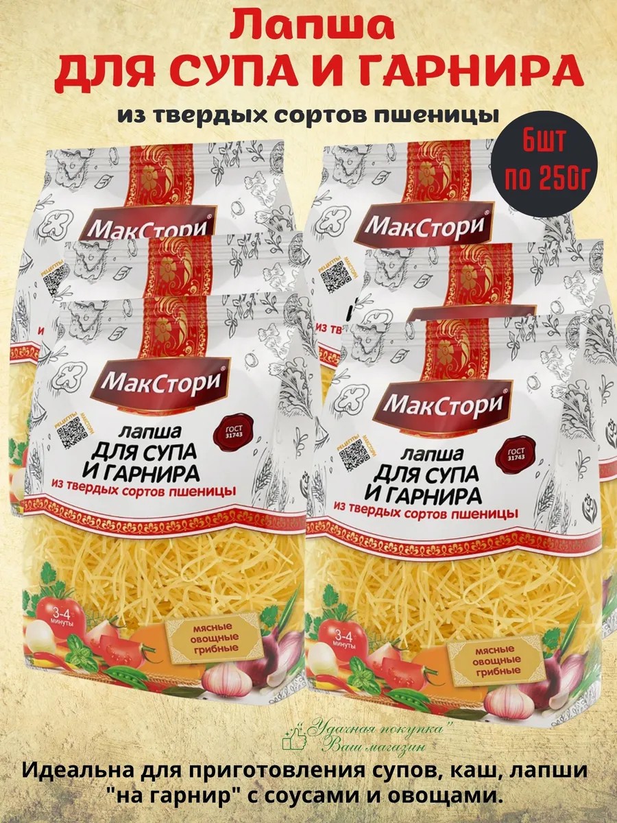 Лапша для супа и гарнира - всегда должна быть под рукой у хозяйки.Идеальна для приготовления супов, каш, лапши "на гарнир" с соусами и овощами.Для приготовления лапши для супа и гарнира компания "МакСтори" использует старинный рецепт, по которому готовили наши предки: тесто раскатывается очень тонко, режется на очень узкие полоски и сушится в печи.