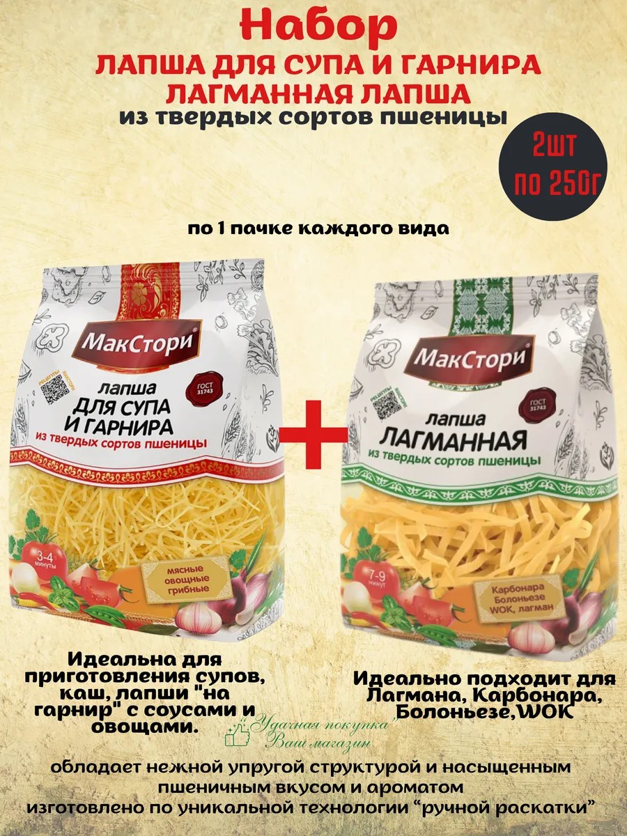 | Комплектация | Лапша для супа и гарнира 250г-1шт; Лагманная лапша250г-1шт |