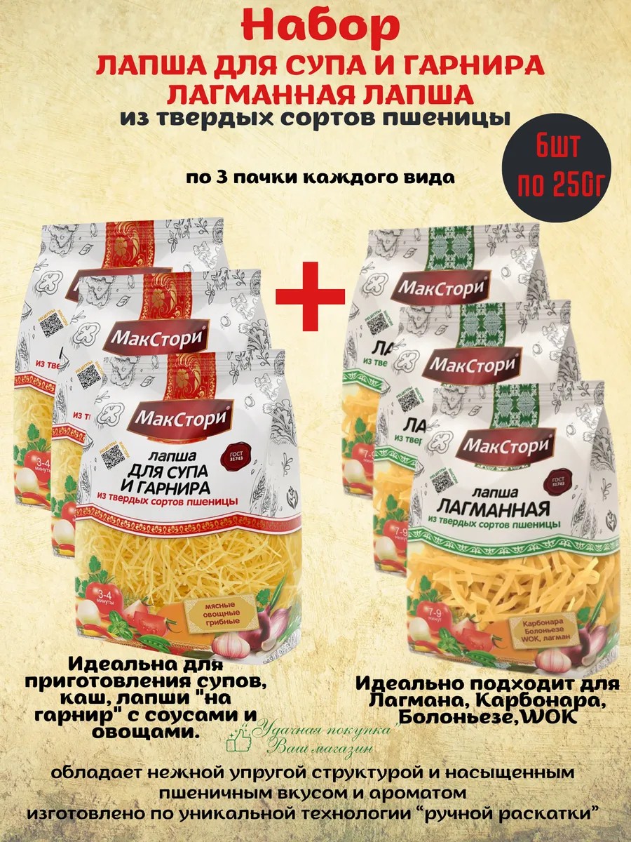 Набор Лапша для супа и Гарнира и Лагманная Лапша, по 3 пачки по 250г каждого вида.