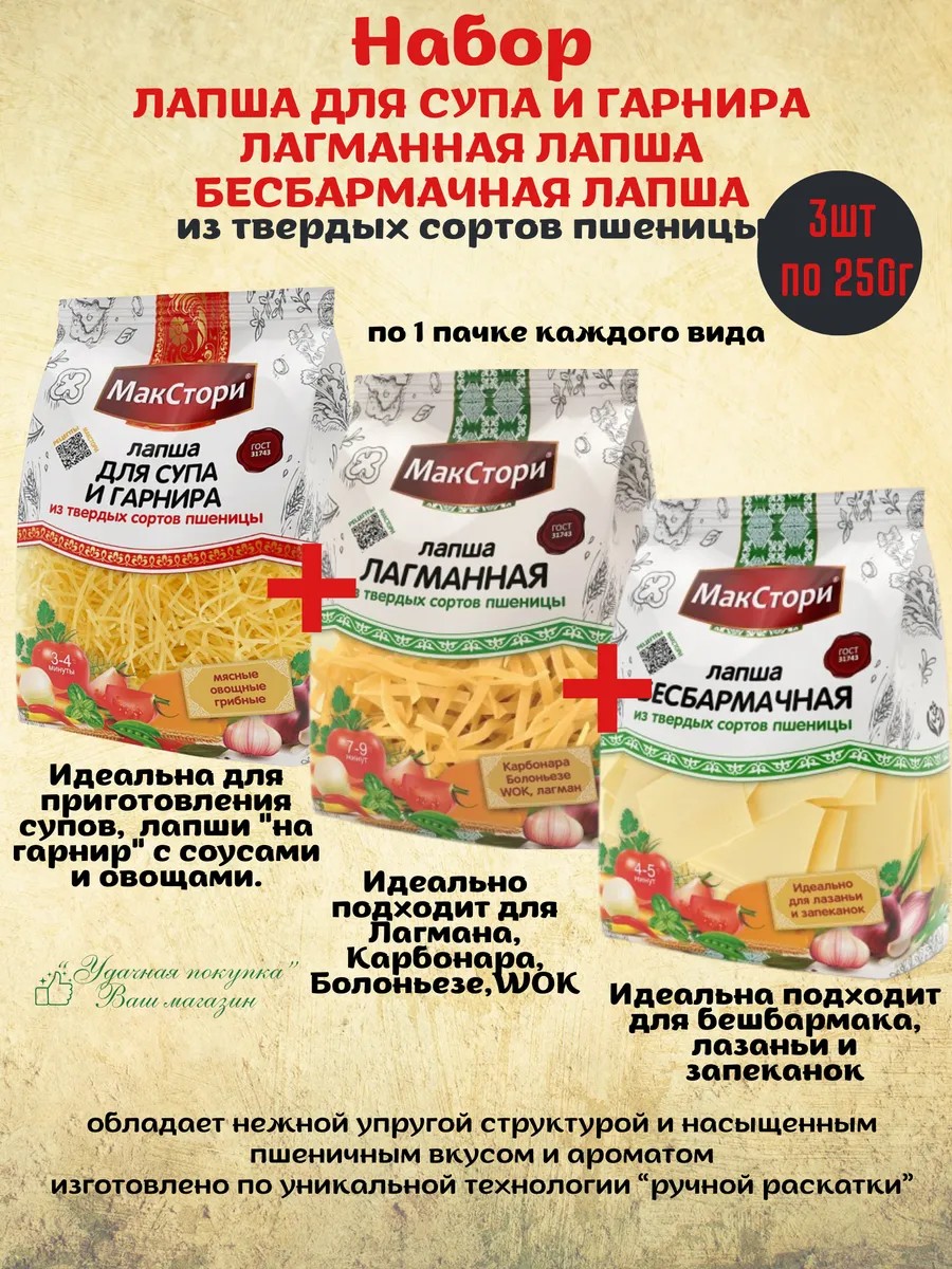 | Комплектация | Лапша для супа и гарнира 250г-1шт; Лагманная лапша250г-1шт; Бесбармачная лапша 250г-1шт |