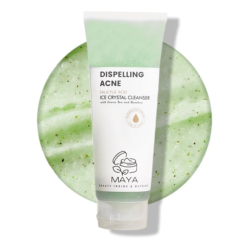 MAYA Ice Crystal Salicylic Acid Cleanser 2% BHA Acne Face Wash with Green Tea and Bamboo Exfoliating Ice Scrub Removes Dead Skin & Clears Pores 120 g
