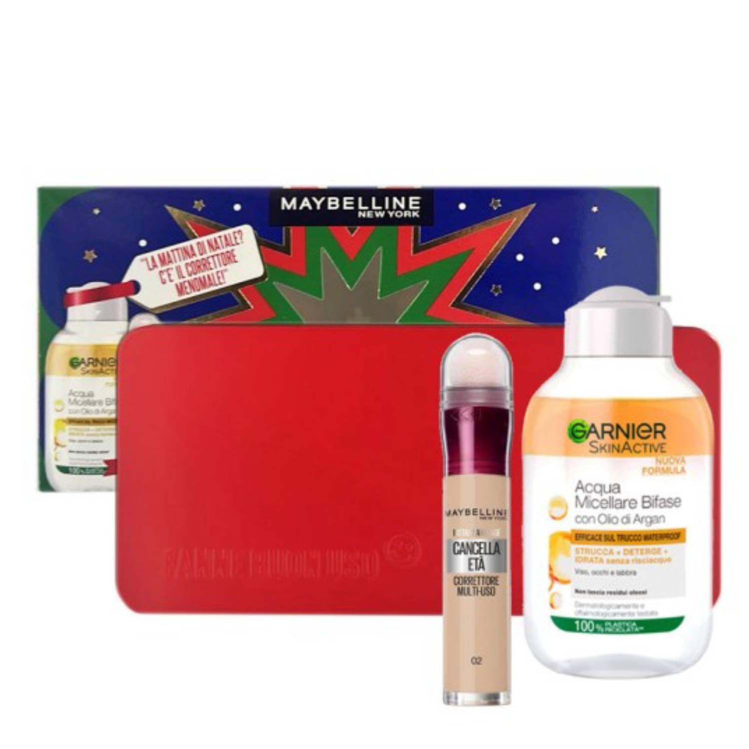 Give the gift of beauty and practicality with this Maybelline set, a perfect gift for those who want a fresh and flawless look every day. An essential set for those seeking quality and convenience, delivered in an elegant and attractive gift box. Perfect for a special gift or for everyday pampering! The set contains: Age Eraser Concealer 02: Discover the secret to a radiant, flawless complexion. With its enriched formula and sponge applicator, this concealer is ideal for covering dark circles, fine lines, and signs of fatigue, giving your skin a luminous and natural finish. Shade 02 adapts to a wide range of skin tones for an even, spotless result. Bi-Phasic Micellar Water 100ml: Your daily ally for gentle and effective cleansing. This bi-phasic micellar water removes makeup, impurities, and excess oil in one step, leaving skin clean, hydrated, and refreshed. Also suitable for waterproof makeup, it's ideal for all skin types, including sensitive skin. Size: Concealer: 1 piece. Micellar water: 100 ml.Maybelline Coffret cadeau femme correcteur Effacer Eta 02 et Garnier eau micellaire biphasique 100 ml avec pochetteDESCRIPTION DU PRODUIT Offrez beauté et praticité avec l'ensemble Maybelline, une idée parfaite pour ceux qui veulent un look frais et impeccable au quotidien. Un ensemble indispensable pour ceux qui recherchent qualité et praticité, livré dans un coffret cadeau élégant et attrayant. Parfait pour un cadeau spécial ou pour vous blottir au quotidien ! Le lot contient : correcteur efface l'âge 02 : découvrez le secret pour un visage radieux et sans imperfections. Avec sa formule enrichie et son applicateur éponge, ce correcteur est idéal pour couvrir les cernes, les lignes fines et les signes de fatigue, donnant à votre peau un effet lumineux et naturel. La teinte 02 s'adapte à une large gamme de teints, pour un résultat uniforme et sans taches. Eau micellaire biphasique 100 ml : votre alliée quotidienne pour un nettoyage doux et efficace. Cette eau micellaire biphasique élimine le maquillage, les impuretés et le sébum en un seul geste, laissant la peau propre, hydratée et fraîche. Convient également pour le maquillage waterproof, il est idéal pour tous les types de peau, y compris la peau sensible. Format : correcteur : 1 pièce. Eau micellaire : 100 ml.
