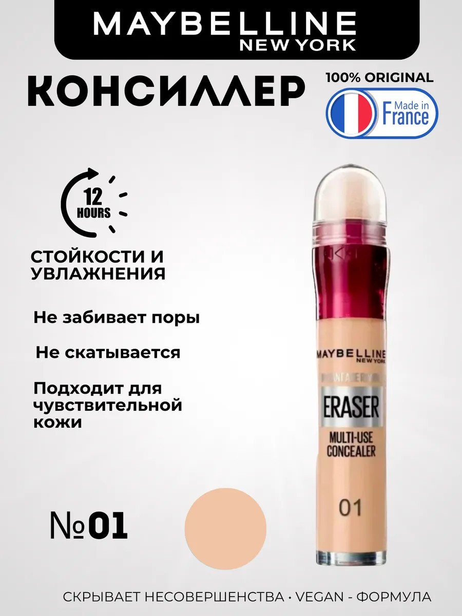 Консилер Instant Eraser от Maybelline New York - это многофункциональное средство для коррекции несовершенств кожи, которое эффективно справляется с маскировкой темных кругов и других проблемных зон.