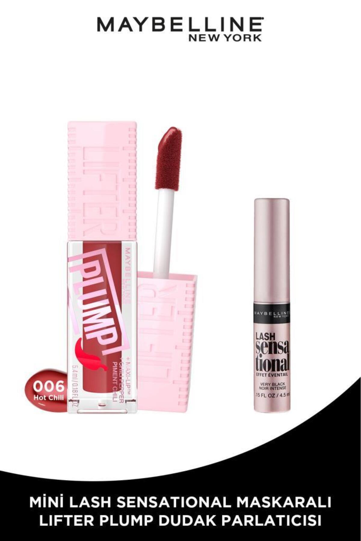 Maybelline New York Lifter Plump Lip Gloss 006 Hot Chili Red & Mini Lash Mascara Makeup Set