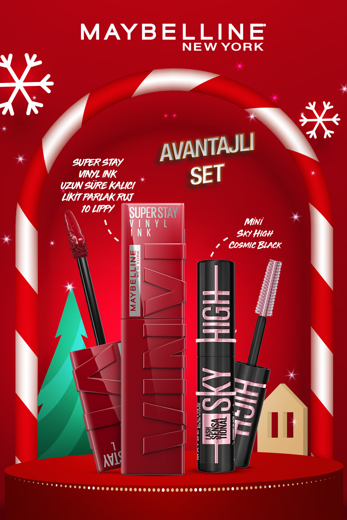 Maybelline New York Super Stay Vinyl Ink Long-Lasting Liquid Glossy Lipstick 10 Lippy & Mini Sky High Cosmic Black Mascara