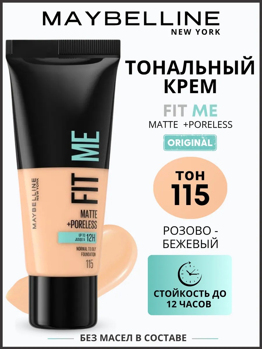 Maybelline New York Оригинал Тональный крем Fit Me тон 115 создает ровное матовое покрытие, без эффекта маски!Формула без масел с пудровыми частицами матирует, скрывает поры и препятствует появлению жирного блеска.Легкая текстура равномерно наносится и распределяется. Тональный крем Fit Me держится в течение всего дня, oщущается ультралегким и дышащим на коже.Тон 95 Светло-фарфоровый. Тон 100 Фарфоровый. Тон 101 Светло-кремовый. Тон 104 Ванильно-бежевый. Тон 105 Светло-бежевый. Тон 110 Слоновая кость.Тон 112-Теплый бежевый .Тон 115-Розово-Бежевый Тон 118 Карамельно-бежевый. Тон 117 кремово-бежевый. Тон 120 классический бежевый