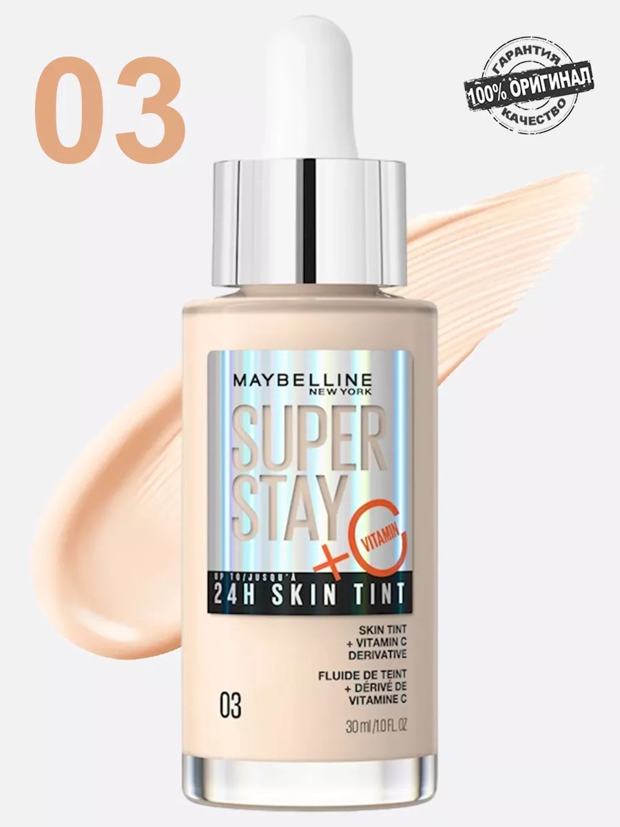 Superstay 24H Skin Tint with Vitamin C Derivative - This non-stop formula delivers vibrant, long-wearing coverage with a natural finish for up to 24 hours. This tint brightens skin and delivers flawless, skin-like coverage with a weightless feel. Maybelline Superstay Skin Tint is water, sweat, and other substances resistant, ensuring comfortable wear all day long. 85% agree that skin looks radiant after 4 weeks of use. Sheer skin coverage and a natural glow. Medium-light coverage, natural-looking finish. How to use: Apply a few drops of product to your face or hands with the convenient dropper, then blend evenly over your entire face with your fingertips, a makeup sponge, or your favorite brush. Gradually add product depending on the desired coverage. Enjoy a flawless, natural result that lasts up to 24 hours. A great gift for Valentine's Day, birthdays, or March 8th.