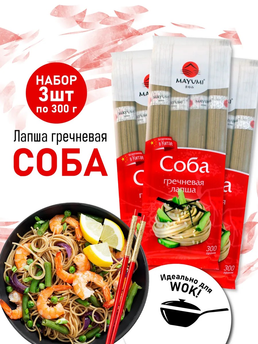 Соба — это лапша из смеси гречневой и пшеничной муки. Гречневую лапшу «Соба» Mayumi отличают серо-коричневый цвет, тонкий аромат и привкус гречки, оригинальный вкус которой отлично оттеняет соевый соус. Углеводы гречневой лапши относятся к категории сложных, но легко усваивающихся. Поэтому, даже при своей немалой калорийности, соба считается диетическим продуктом. Минимальное время приготовления «Соба» позволяет сохранить все, чем ценится гречка: витамины В1 и В2, флавоноиды, квеерцетин, тиамин, рибофлавин, рутин, холин, аминокислоты, — это далеко не полный список ее полезных составляющих.