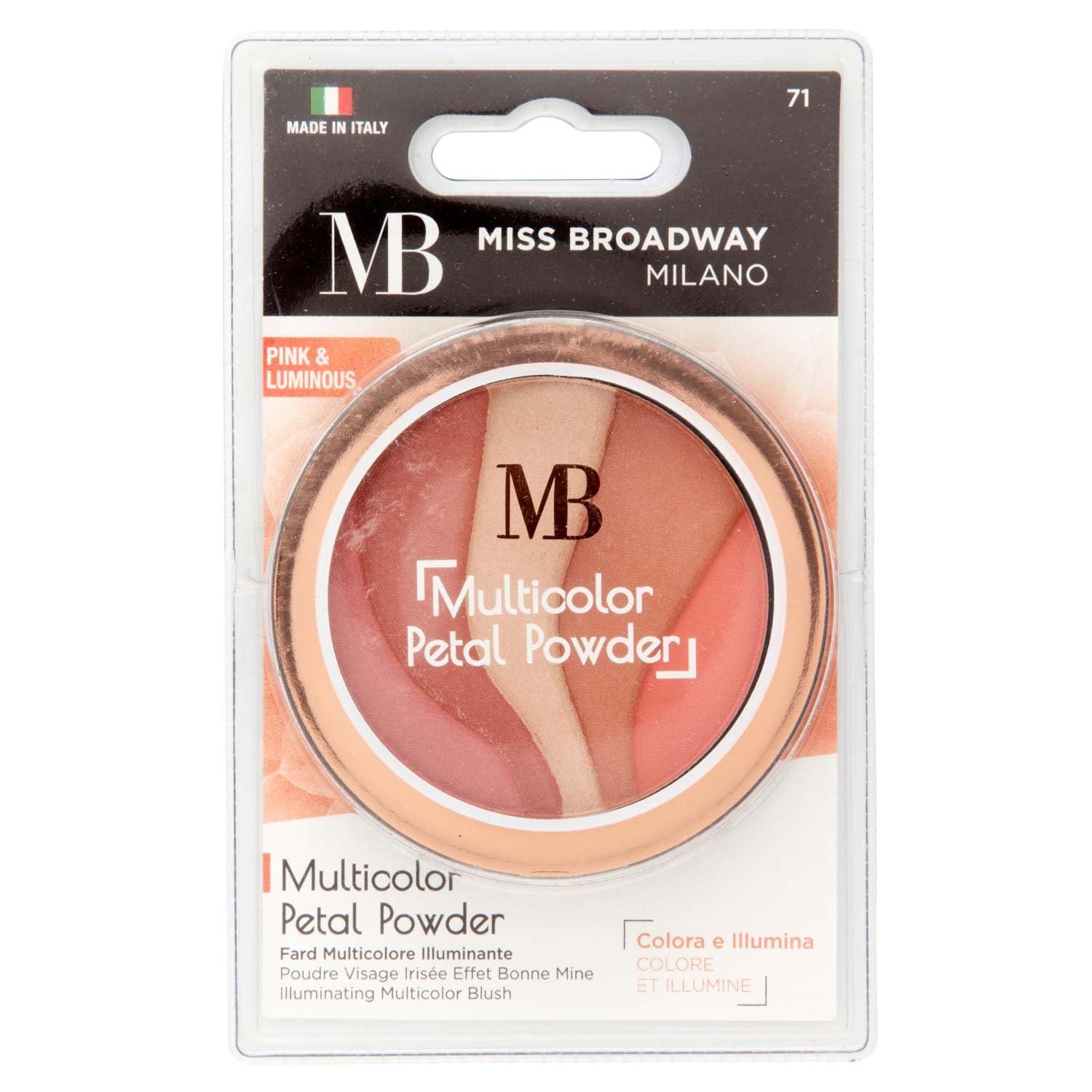 : Delicate and soft texture, like a petal. The combination of several shades creates a natural, radiant, healthy glow. Phytologically tested formula. Apply and blend onto the face using the powder brush. Made in Italy. 9 grams. MB MILANO is an Italian makeup brand, with 100 of its production taking place in Europe, 90 of which is in Italy. This modern brand is developed in collaboration with professional makeup artists and focuses on makeup bestsellers. A complete range of high-quality products at attractive prices to meet all your beauty needs. Ingredients TALC, MICA, PARAFFINUM LIQUIDUM [MINERAL OIL], MAGNESIUM STEARATE, LANOLIN OIL, SODIUM DEHYDROACETATE, PHENOXYETHANOL, DIETHYLHEXYL SYRINGYLIDENEMALONATE, PARFUM [FRAGRANCE], TIN OXIDE, CAPRYLIC CAPRIC TRIGLYCERIDE, BHT, BENZYL SALICYLATE, HYDROXYCITRONELLAL, CITRONELLOL, COUMARIN, EUGENOL. ( - CI 77891 [TITANIUM DIOXIDE], CI 77491 [IRON OXIDES], CI 77492 [IRON OXIDES], CI 15850 [RED 6 LAKE - RED 7 LAKE - RED 6], CI 77742 [MANGANESE VIOLET], CI 77499 [IRON OXIDES], CI 15985 [YELLOW 6 LAKE], CI 45410 [RED 27 LAKE - RED 28 LAKE]. P.when('A').execute(function(A) { A.on('a:expander:toggle_description:toggle:collapse', function(data) { window.scroll(0, data.expander. expander[0].offsetTop-100) }) }) Safety Warning: Avoid contact with eyes. See moreNatural effect. Delicate and soft. Colors and illuminates.Description du produit Texture délicate et douce comme une pétale. La combinaison de plusieurs teintes permet d'avoir un effet bonne mine naturel et lumineux. FORMULE TESTÉE DEPMATOLOGIQUEMENT. A l'aide du pinceau poudre appliquez et estompez sur le visage. Fabriqué en Italie. 9 grammes. MB MILANO est une marque italienne de maquillage, pour laquelle 100 de la production est faite en Europe, dont 90 en Italie. Cette marque moderne est développée en collaboration avec des make-up artistes professionnels et centrée sur les best-sellers du maquillage. Gamme complète de produits de haute qualité à prix attractif pour répondre à tous les besoins beauté. Ingrédients TALC, MICA, PARAFFINUM LIQUIDUM [MINERAL OIL], MAGNESIUM STEARATE, LANOLIN OIL, SODIUM DEHYDROACETATE, PHENOXYETHANOL, DIETHYLHEXYL SYRINGYLIDENEMALONATE, PARFUM [FRAGRANCE], TIN OXIDE, CAPRYLIC CAPRIC TRIGLYCERIDE, BHT, BENZYL SALICYLATE, HYDROXYCITRONELLAL, CITRONELLOL, COUMARIN, EUGENOL. ( - CI 77891 [TITANIUM DIOXIDE], CI 77491 [IRON OXIDES], CI 77492 [IRON OXIDES], CI 15850 [RED 6 LAKE - RED 7 LAKE - RED 6], CI 77742 [MANGANESE VIOLET], CI 77499 [IRON OXIDES], CI 15985 [YELLOW 6 LAKE], CI 45410 [RED 27 LAKE - RED 28 LAKE]. P.when('A').execute(function(A) { A.on('a:expander:toggle_description:toggle:collapse', function(data) { window.scroll(0, data.expander. expander[0].offsetTop-100) }) }) Avertissement De Sûreté Eviter tout contact avec les yeux. Voir plusEffet naturel. Délicate et douce. Colore et illumine.MB Milano - Poudre Bonne Mine -PINK LUMINOUS