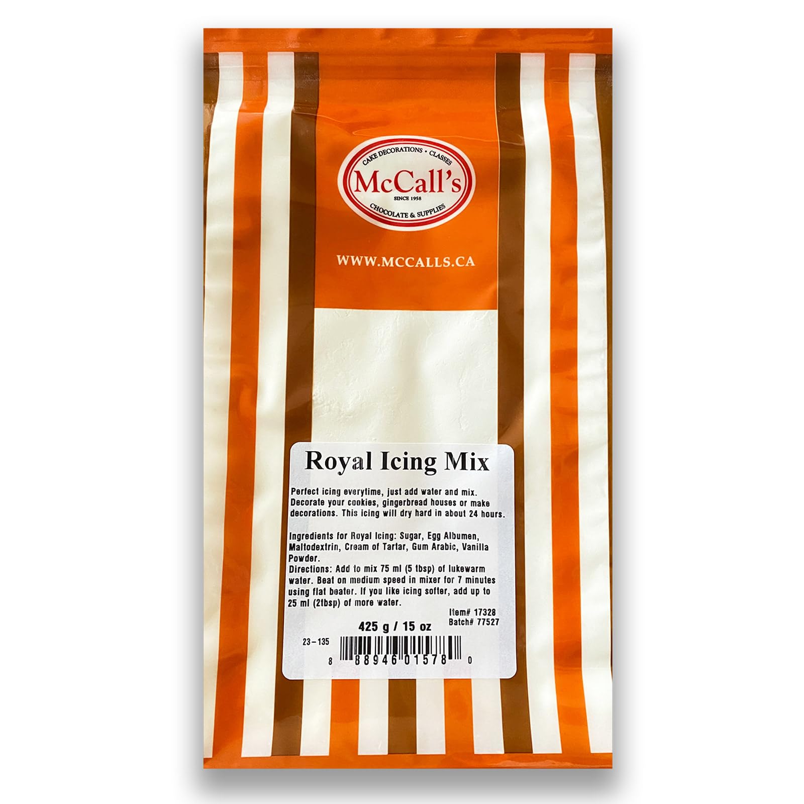 Perfect icing everytime, just add water and mix. Decorate your cookies, gingerbread houses or make decorations. This icing will dry hard in about 24 hours. Ingredients for Royal Icing: Sugar, Egg Albumen, Maltodextrin, Cream of Tartar, Gum Arabic, Vanilla Powder. Directions: Add to mix 75 mil (5 tbsp) of lukewarm water. Beat on medium speed in mixer for 7 minutes using flat beater. If you like icing softer add up to 25 ml (2 tbsp) of more water. Helpful Hint : Royal icing must be kept moist when not in use. Cover bowl with a damp cloth or lid when not in use to prevent drying out. Size: 15 ounce or 425 grams15 ounce or 425 g. Royal icing must be kept moist when not in use. Royal Icing will dry hard in about 24 hours. To decorate cookies, gingerbread houses or make decorations.