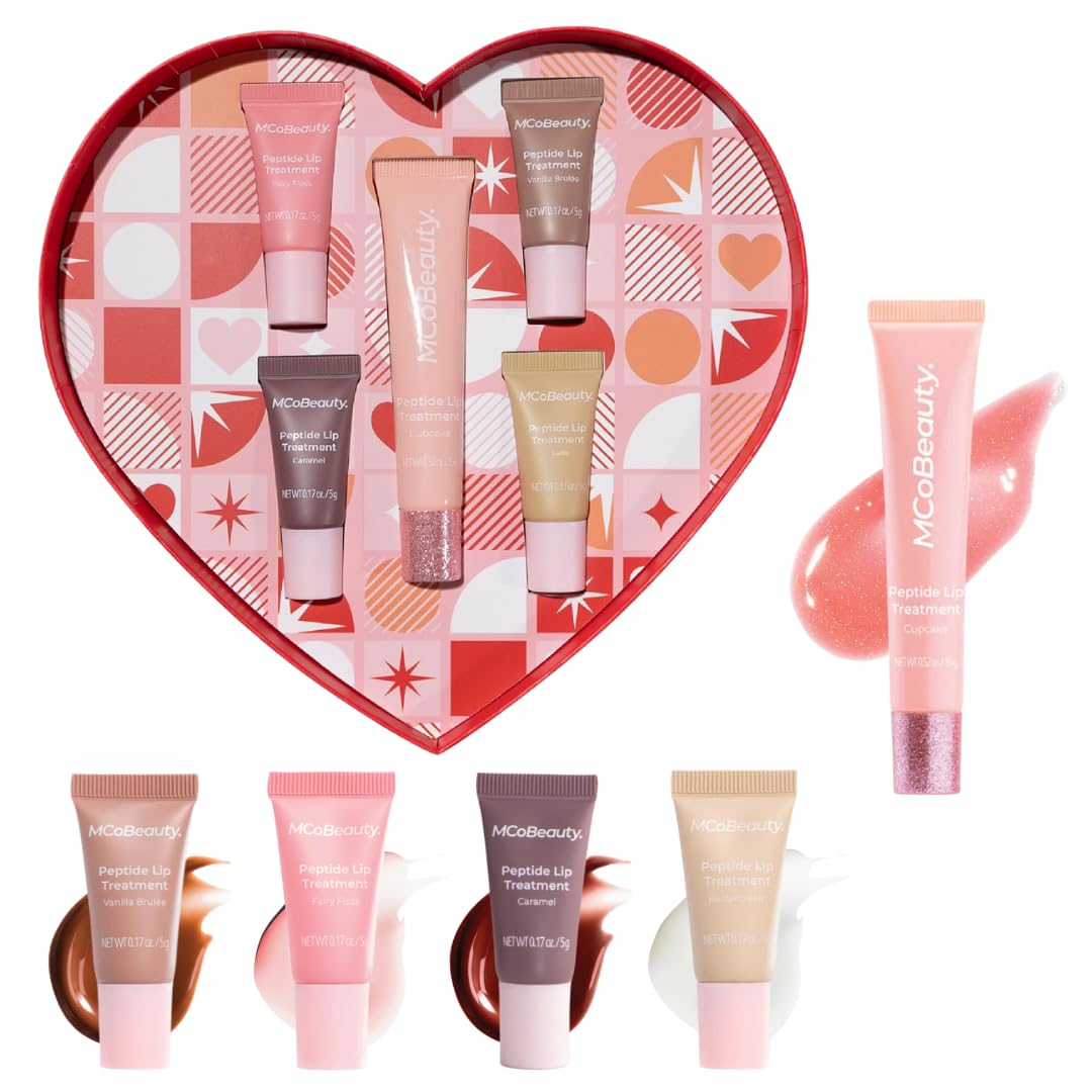 JUICY LIP GLAZE TREATMENTS IN ONE CUTE SET: Sweetheart Peptide Lip Treatment Set gives you a full-size peptide lip treatment plus four minis, each with a juicy, lip-glazing finish. It's more than a gloss - it cushions lips with shine while wrapping them in rich, conditioning care.NON-STICKY CREAM-OIL FORMULA WITH GLOSSY FINISH: Lip-glazing texture that feels rich and cushiony while remaining non-sticky, ideal for customers who want a high-shine gloss look with the comfort of a nourishing balm. LIP TREATMENT SET FOR DRY, CRACKED LIPS: Lip treatment kit featuring peptide-powered cream-oil gloss balms designed to help hydrate, condition and comfort dry or cracked lips while delivering glossy color. PERFECT GIFT-READY LIP KIT FOR ANY OCCASION: With one full-sized tube for everyday use and four mini-sized tubes for bags, desks and travel, this set is made for gifting and collecting. It's a cute, cruelty free lip set for holidays, birthdays, Valentine's, stocking stuffers or treating yourself. ALL-IN-ONE LIP GLOSS, BALM TINT: The cream-oil formula works as a gloss, balm and tint in one step. It helps lock in moisture, protect lips from dryness and leave a lip-glazing wash of color you can wear alone or layer over lip liner and lipstick. Non-sticky, cushiony and comfortable for all-day shine. SUGARY-SWEET CUPCAKE, LATTE, FAIRY FLOSS, CARAMEL VANILLA SCENTS: The set features decadent, dessert-inspired scents Cupcake, Latte, Fairy Floss, Caramel and Vanilla Brûlée so you can pick a flavor to match your mood. Each one leaves a glossy hint of color with a sweet, addictive scent. PEPTIDES SHEA BUTTER FOR SOFTER, PLUMPER-LOOKING LIPS: Each lip treatment is loaded with lip-loving peptides and Shea Butter to help moisturize, cushion and smooth the look of dry, cracked lips. With every swipe, lips feel more nourished and look naturally plumper and more pillowy.
