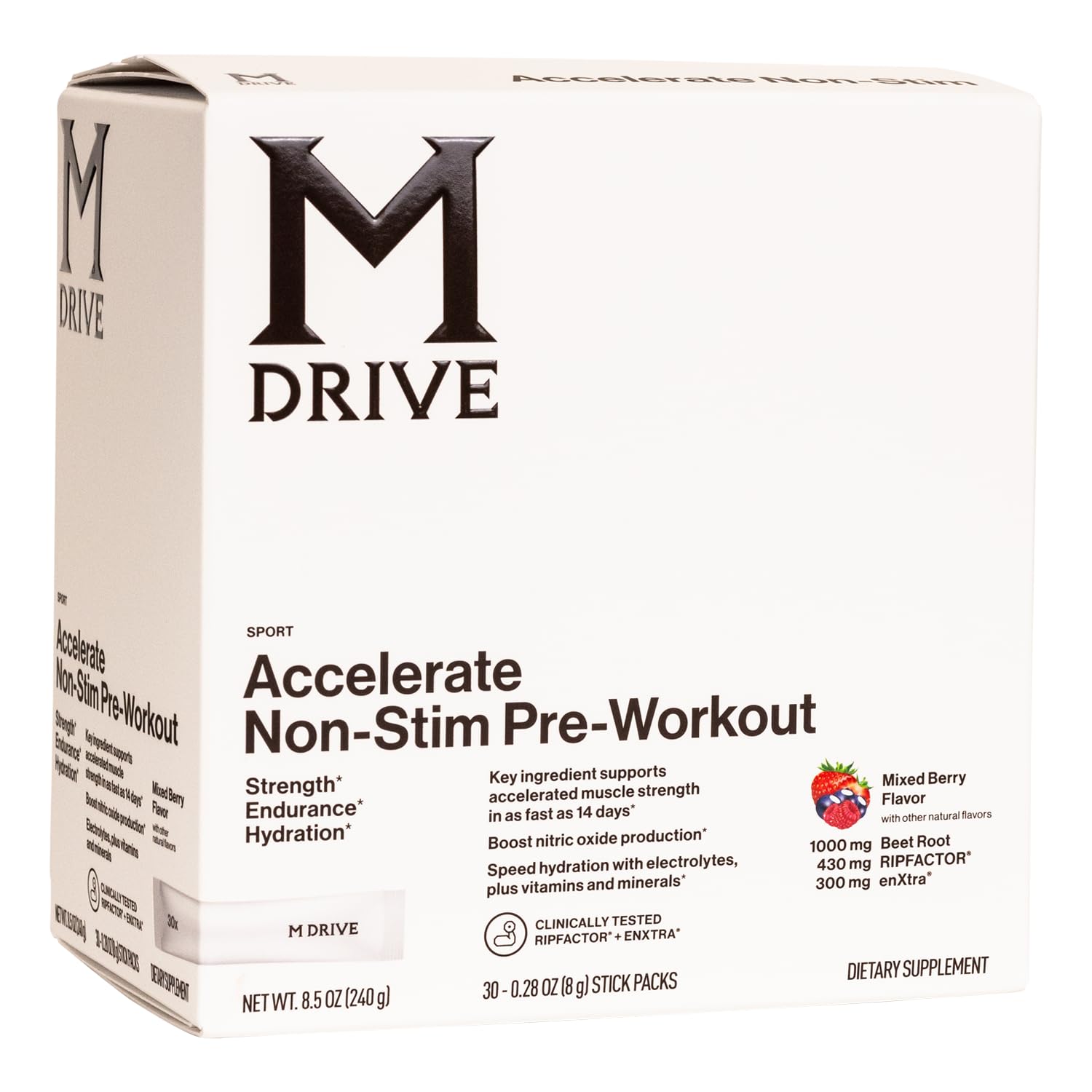 No more fumbling around with powders - each our pre-workouts come pre-portioned in satchels Mixed Berry flavor mixes easily. To get optimal performance out of your workout, simply add Accelerate pre-workout from one convenient stick pack into 8 ounces of water or a liquid of your choice blend or mix thoroughly and drink 15 to 30 minutes prior to physical activity. Pair your Accelerate pre-workout with our M Drive Elite for improved endurance, recovery, and higher energy levels a healthier, smarter combination of clinically-tested, plant-based ingredients - the white box is stimulant free. Speeds hydration with electrolytes, plus vitamins our pre-workout increases focus alertness from tested ingredients - RipFACTOR EnXtra. Mdrive Accelerate Pre-Workout helps improve strength gains in as fast as 2 weeks Our pre workout powder in a single serving satchel boosts pump with increased Nitric Oxide production.