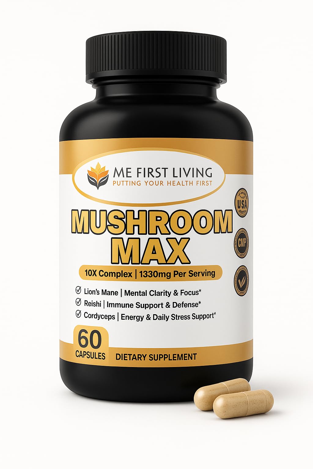Convenient Easy to Use: Mushroom Max is easy to take and can be taken with or without food. It comes in a convenient capsule form that makes it easy to incorporate into your daily routine. Natural Organic Ingredients: Me First Living Mushroom Max is made with all-natural, organic ingredients. Each capsule is free from artificial additives, fillers, or preservatives, ensuring that you get a pure and safe product. Improved Mood Well-being: Mushroom Max contains ingredients that are known for their mood-boosting properties promoting a happy and healthy mindset. Mushroom Max also includes Chaga, which has been shown to support immune function and overall well-being. Enhanced Focus Memory: Lion's Mane is known for its ability to improve focus, memory, and cognitive function. Studies have shown that it can enhance brain activity, improve memory recall, and support healthy brain function. 10 in 1 Brain Supplement: Me First Living Mushroom Max contains a powerful blend of 10 premium mushrooms, including Lion's Mane, Cordyceps, Turkey Tail, Reishi, Maitake, Chaga, and more. Each capsule provides a high-strength dose of these mushrooms, known for their cognitive-enhancing properties.