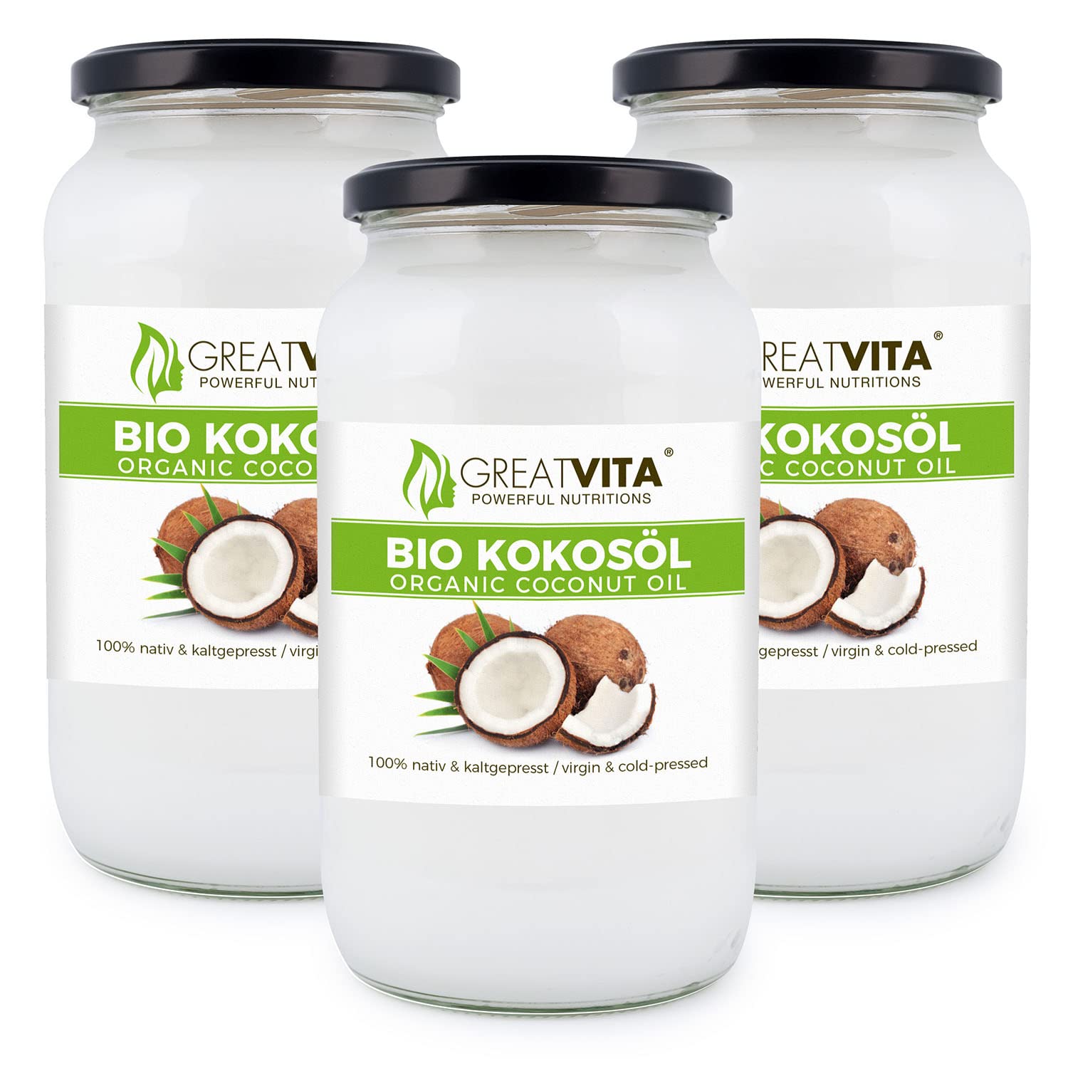 GreatVita Huile de coco bio Native (3 x 1000 ml) dans un verre pour cuisiner rôtir et faire des soins de la peau 1000 ml (3er Pack)